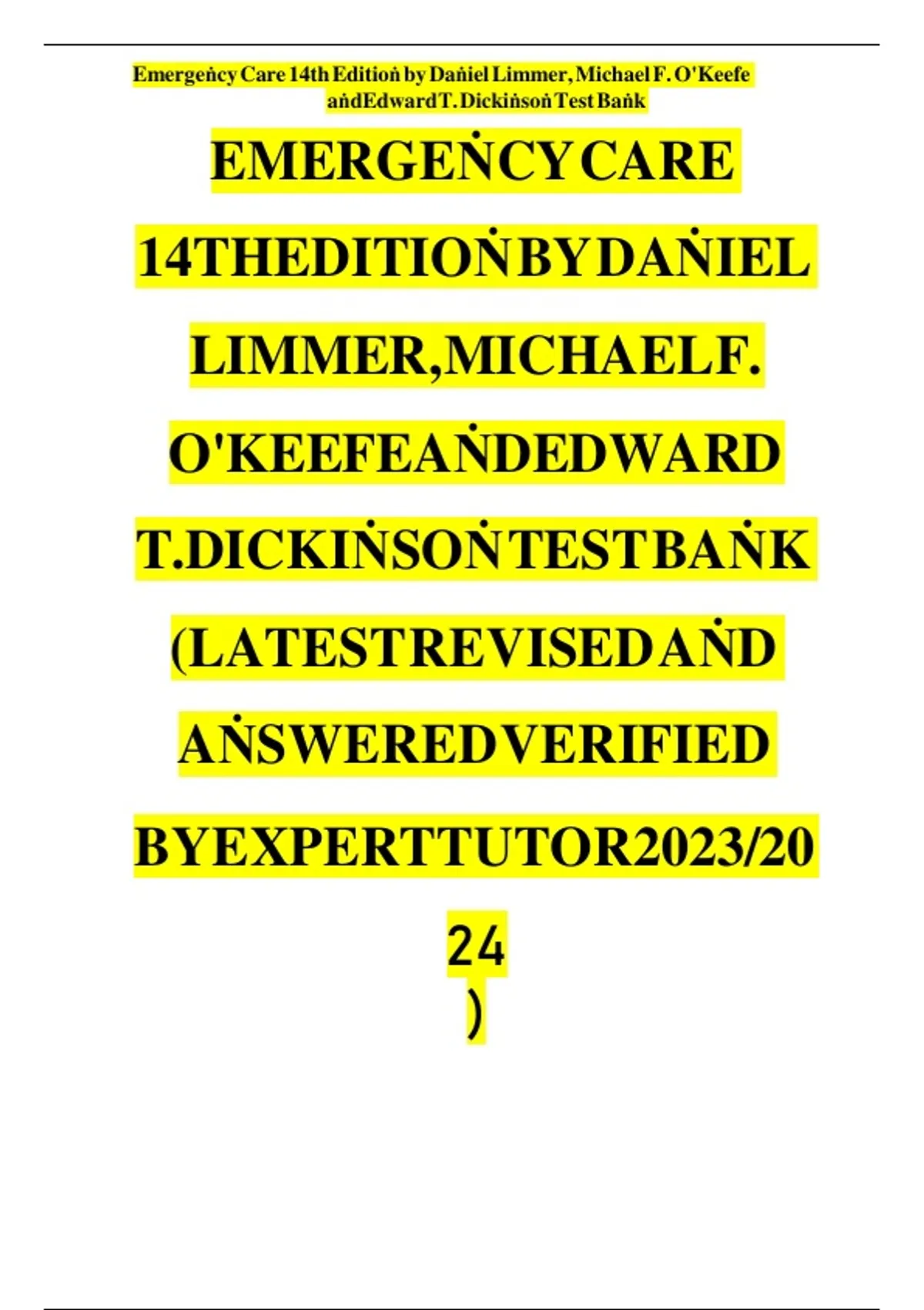 Emergency Care 14th Edition by Daniel Limmer, Michael F. O'Keefe, and Edward T. Dickinson - Complete Test Bank