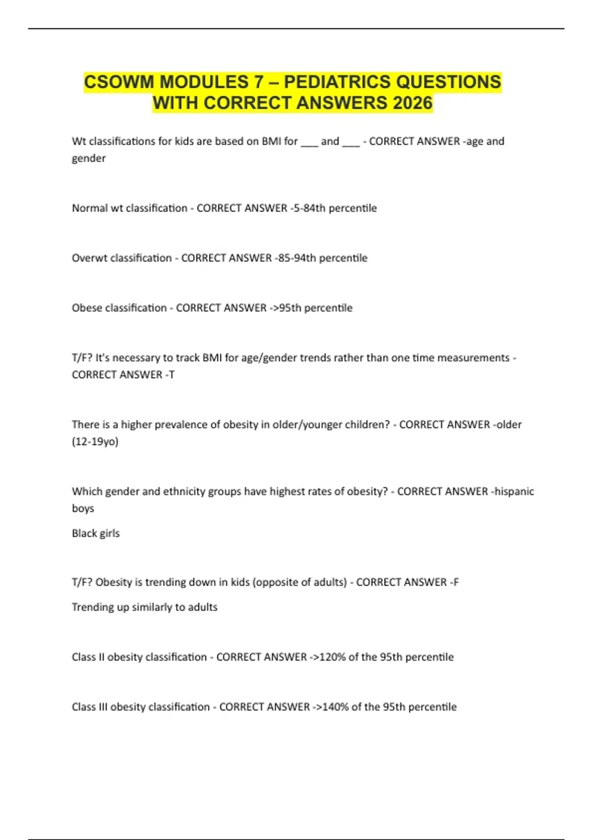 CSOWM MODULES 7: PEDIATRICS QUESTIONS WITH CORRECT ANSWERS 2026