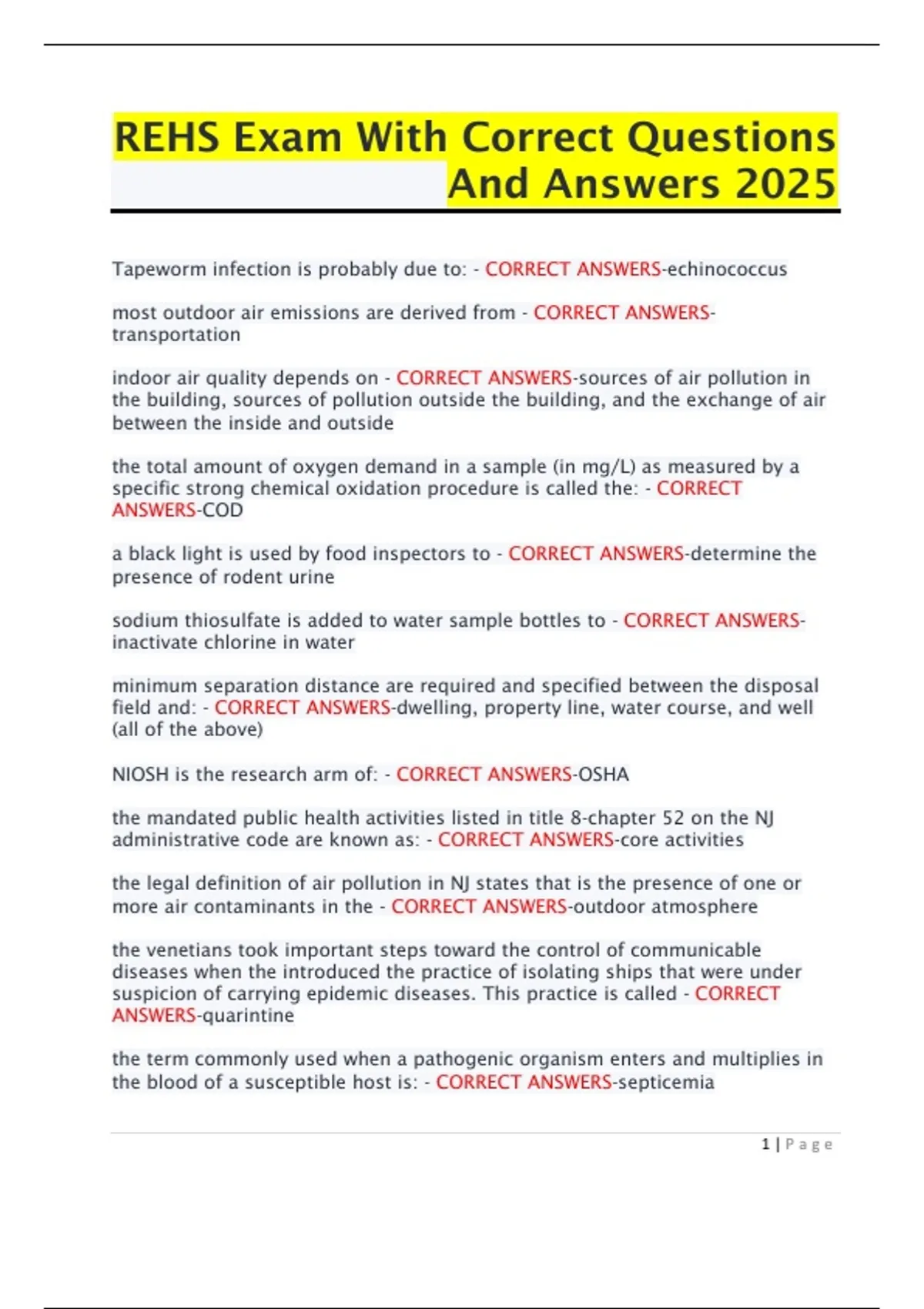 The REHS Exam Questions and Answers 2025 resource provides accurate, exam-style questions with verified correct answers to support Registered Environmental Health Specialist certification success. Covering food safety, water and wastewater systems, solid waste management, vector control, epidemiology, environmental regulations, and public health principles, this exam prep guide improves exam readiness, reinforces core competencies, and builds confidence for successful performance on the REHS examination.