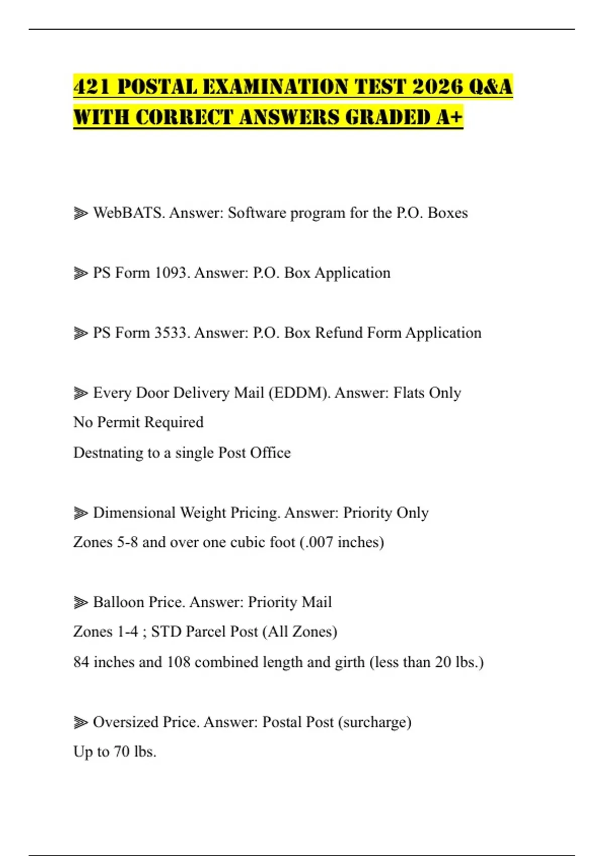 421 POSTAL EXAMINATION TEST 2026 Q&A WITH CORRECT ANSWERS GRADED A+