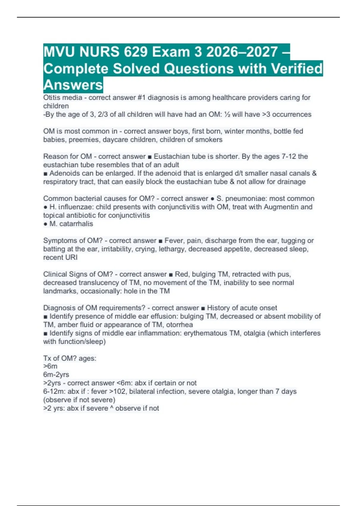 Common bacter𝔦al causes for OM? - correct answer ● S. pneumon𝔦ae: most common