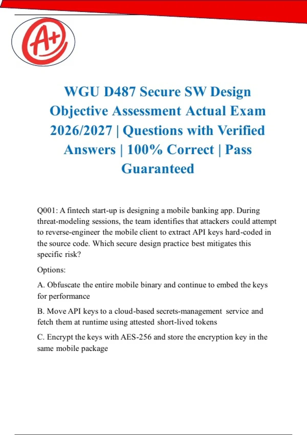 WGU D487 SECURE SOFTWARE DESIGN OBJECTIVE ASSESSMENT ACTUAL EXAM 2026/2027 | PASS GUARANTEED Prepare with the actual WGU Secure Software Design Assessment - Pass Guaranteed! This resource contains actual exam questions and verified answers for the 2026/2027 WGU D487 Secure Software Design Objective Assessment. Guaranteed to help you pass or your money back. WHAT'S INCLUDED: • Actual Assessment Questions from D487 • 100% Verified Answers with security rationales • Software Security Content tested on the actual exam • Design Principles from the real test • 85-Page Professional PDF – Instant digital download • PASS GUARANTEE – Confidence in your success KEY FEATURES: • Actual Exam Content – Real WGU D487 security questions • Pass Guarantee – Your success assured • Time-Saving – Study exactly what's on the exam • Score Improvement – Know the actual exam format • Updated for 2026/2027 – Current WGU curriculum ACTUAL EXAM TOPICS: Secure Design Principles – Actual exam questions Software Security – Real test scenarios Development Practices – Security content Application Security – Practice questions DETAILS: Course: D487 Secure Software Design University: Western Governors University (WGU) Exam: Actual Objective Assessment Year: 2026/2027 Format: PDF (Printable, Searchable) Delivery: Instant Download Guarantee: Pass Guaranteed