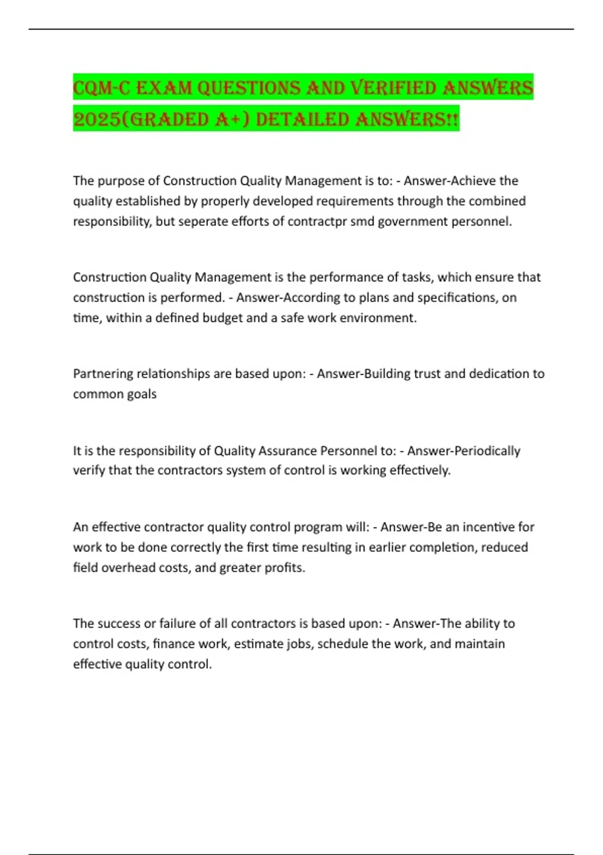 The purpose of Construction Quality Management is to: - Answer-Achieve the quality established by properly developed requirements through the combined responsibility, but seperate efforts of contractpr smd government personnel. Construction Quality Management is the performance of tasks, which ensure that construction is performed. - Answer-According to plans and specifications, on t ime, within a defined budget and a safe work environment. Partnering relationships are based upon: - Answer-Building trust and dedication to common goals It is the responsibility of Quality Assurance Personnel to: - Answer-Periodically verify that the contractors system of control is working effectively. An effective contractor quality control program will: - Answer-Be an incentive for work to be done correctly the first time resulting in earlier completion, reduced field overhead costs, and greater profits.