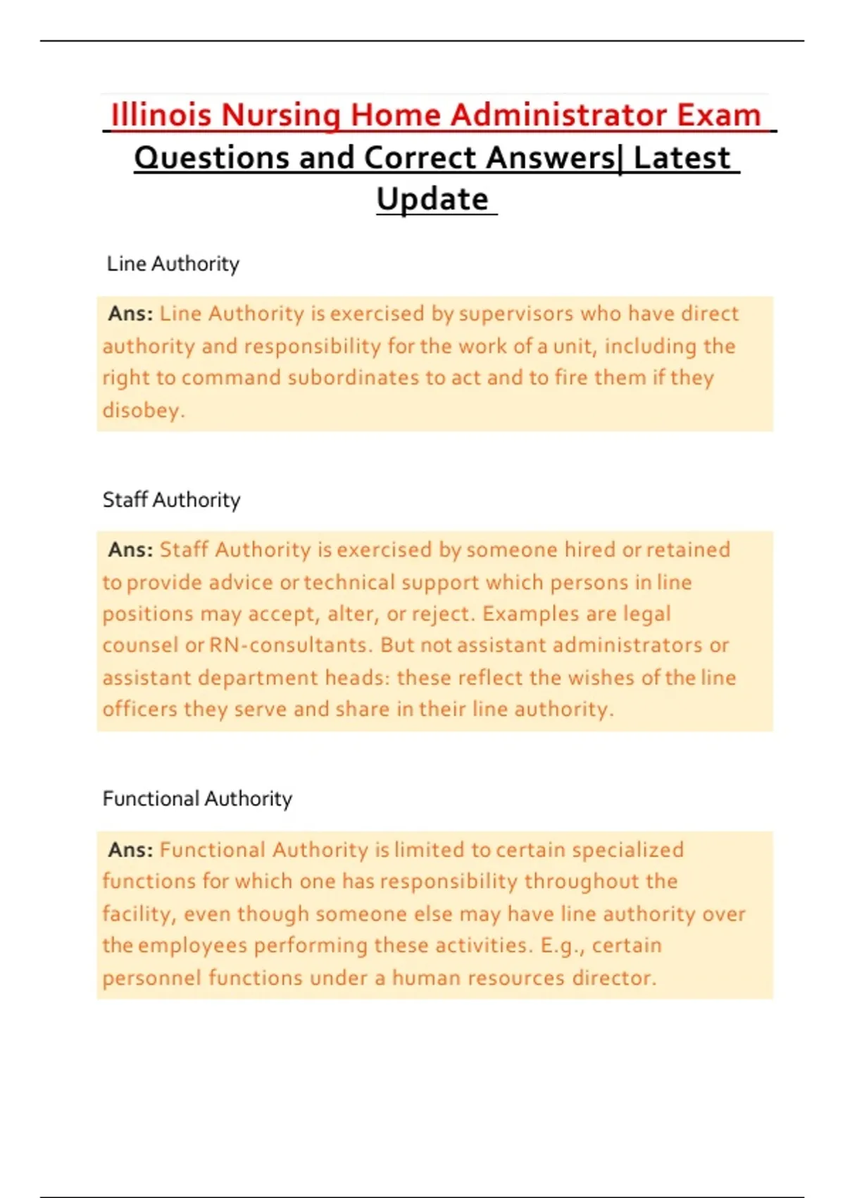This document is the latest updated Illinois Nursing Home Administrator exam study guide containing actual exam questions with correct answers and clear definitions aligned with current Illinois licensure requirements. It focuses heavily on administrative law, healthcare management, legal terminology, ethics, risk management, human resources, and regulatory compliance relevant to long-term care facility administration in Illinois. The content includes key concepts such as line, staff, and functional authority, unity of command, fiduciary duty, tort law, negligence, liability doctrines, employment law principles, and court-related legal terms frequently tested on the Illinois Nursing Home Administrator exam. This material is designed to support efficient exam preparation, reinforce core administrative knowledge, and improve confidence for first-time and repeat test takers.