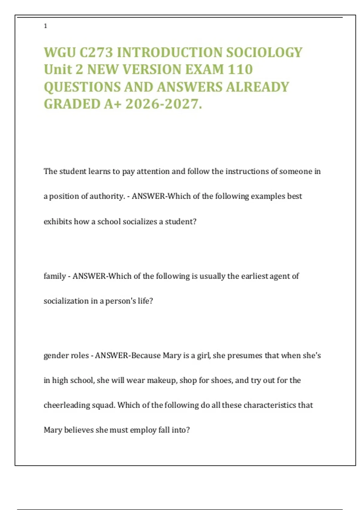 A comprehensive exam preparation resource for WGU's C273 Introduction to Sociology Unit 2. This guide includes 110 questions and answers already graded A+, covering key topics such as socialization, culture, norms, gender, agents of socialization, and sociological theories. Ideal for review, self-study, and ensuring mastery of Unit 2 content for the academic cycle.