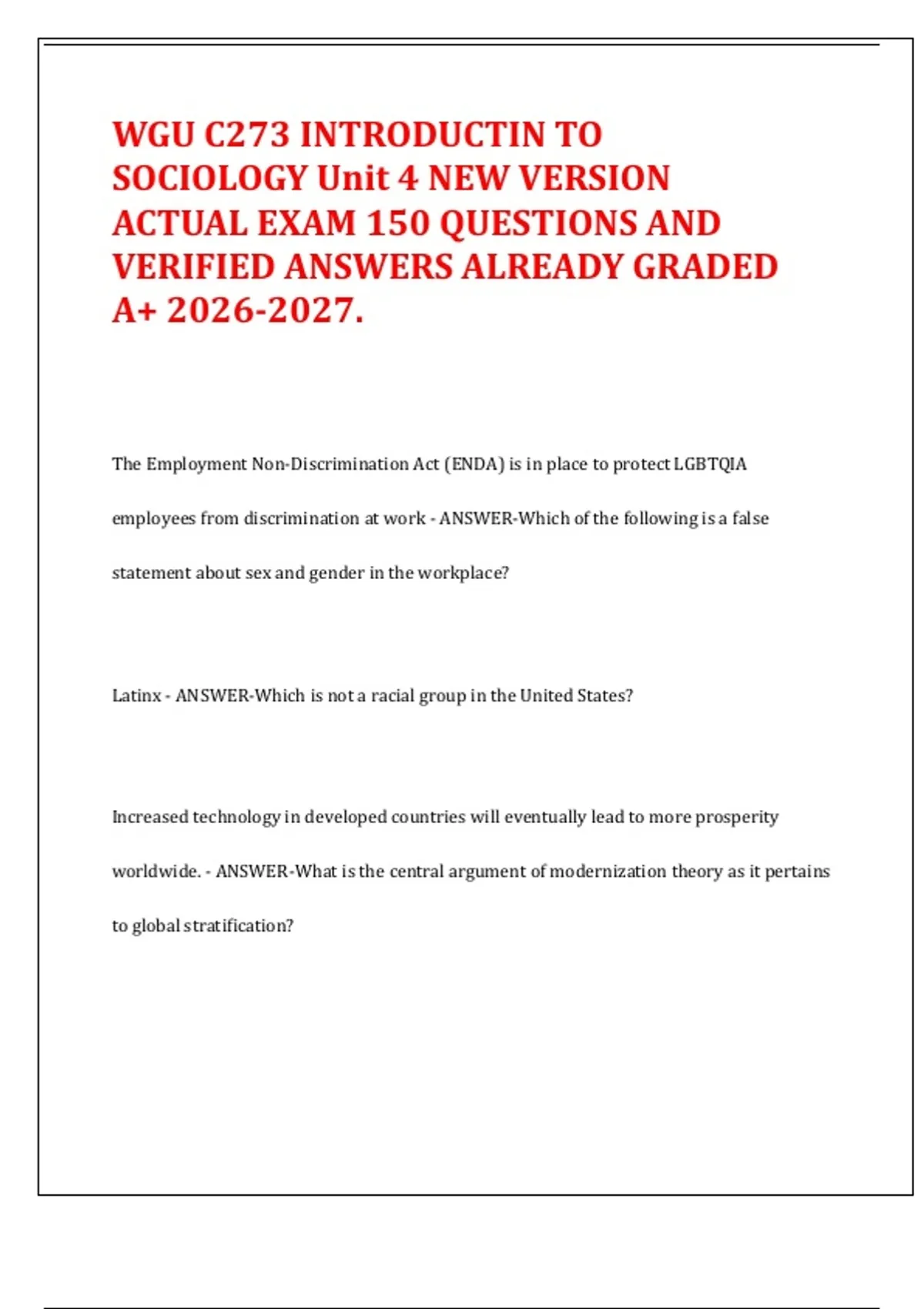 This comprehensive study guide contains 150 actual exam questions and verified answers for WGU C273 Introduction to Sociology Unit 4. Covering key topics such as social stratification, gender and sex in the workplace, race and ethnicity, poverty, bias and discrimination, and global inequality, this resource is designed to help students prepare effectively for the Unit 4 assessment. Each question is paired with a detailed answer, making it an essential tool for review and exam readiness. Ideal for WGU sociology students seeking a thorough understanding of Unit 4 concepts and terminology.