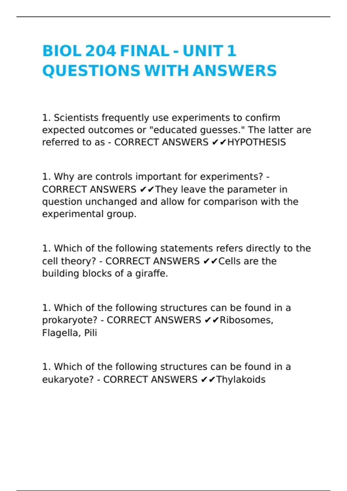 BIOL 204 FINAL - UNIT 1 QUESTIONS WITH ANSWERS