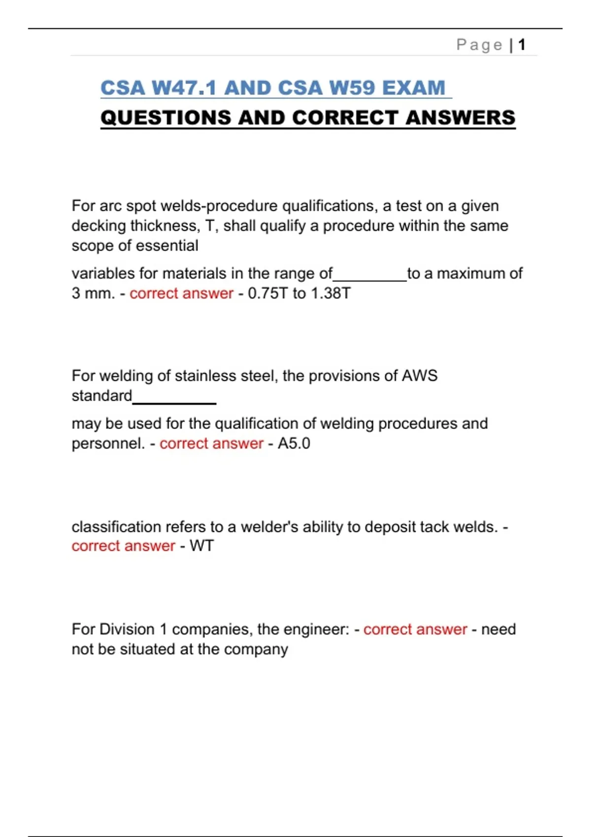 This document is the updated CSA W47.1 and CSA W59 exam study guide containing exam questions with correct, verified answers aligned with current Canadian Welding Bureau (CWB) requirements and CSA welding standards. It covers essential topics such as welder and welding supervisor qualifications, procedure qualification records, prequalified joints, welding positions and classifications, inspection and testing methods (VT, RT, UT), allowable discontinuities, preheat and interpass temperatures, filler metals, joint design, fillet and groove weld requirements, and responsibilities under CSA W47.1 and W59. The material is designed to support effective exam preparation for welders, welding supervisors, inspectors, and contractors working in structural steel fabrication and erection. It reinforces code compliance, technical understanding, and confidence for candidates preparing for CSA W47.1 and CSA W59 certification exams.