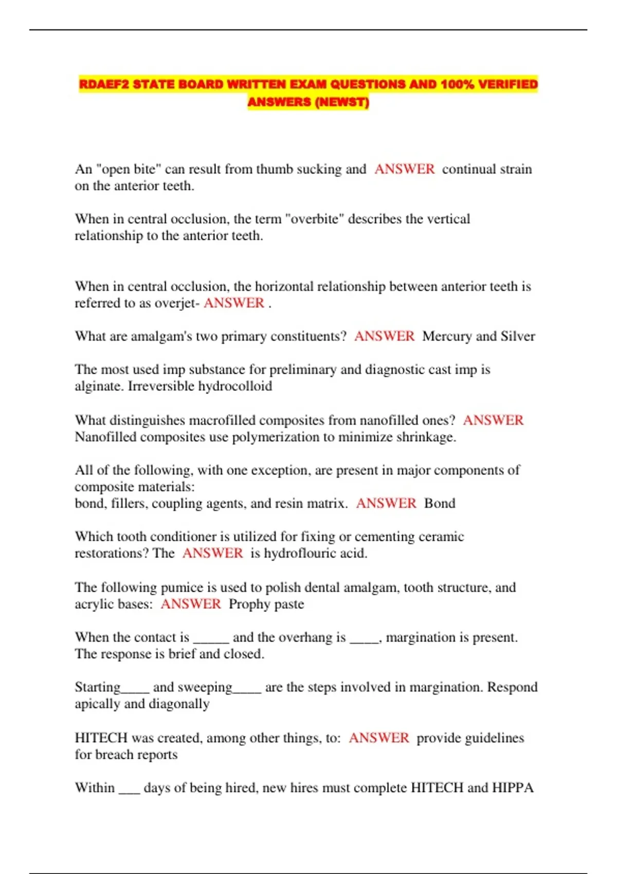 RDAEF2 STATE BOARD WRITTEN EXAM QUESTIONS AND 100% VERIFIED