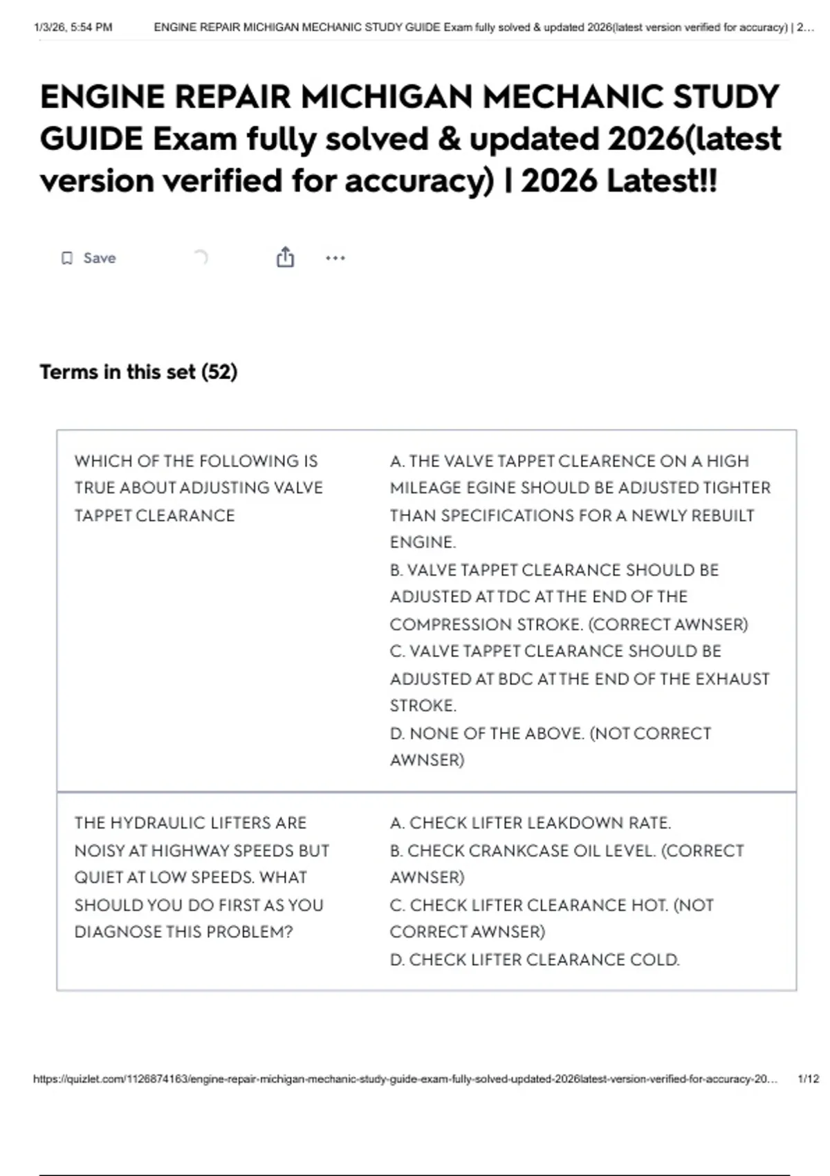 https://quizlet.com/1126874163/engine-repair-michigan-mechanic-study-guide-exam-fully-solved-updated-2026latest-version-verified-for-accuracy-20… 1/12