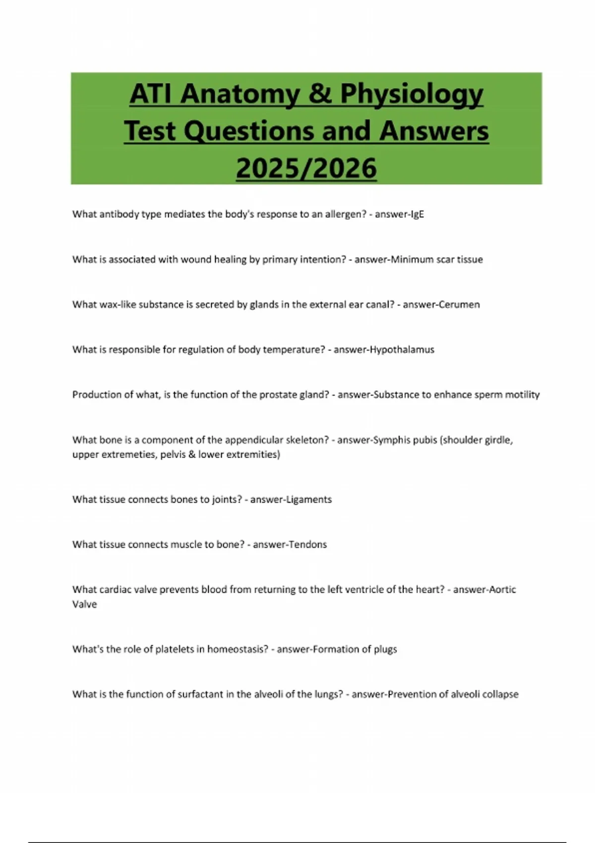 ATI Anatomy & Physiology Test Questions and Answers 2025/2026 What antibody type mediates the body's response to an allergen? - answer-IgE What is associated with wound healing by primary intention? - answer-Minimum scar tissue What wax-like substance is secreted by glands in the external ear canal? - answer-Cerumen What is responsible for regulation of body temperature? - answer-Hypothalamus Production of what, is the function of the prostate gland? - answer-Substance to enhance sperm motility What bone is a component of the appendicular skeleton? - answer-Symphis pubis (shoulder girdle, upper extremeties, pelvis & lower extremities) What tissue connects bones to joints? - answer-Ligaments What tissue connects muscle to bone? - answer-Tendons What cardiac valve prevents blood from returning to the left ventricle of the heart? - answer-Aortic Valve What's the role of platelets in homeostasis? - answer-Formation of plugs What is the function of surfactant in the alveoli of the lungs? - answer-Prevention of alveoli collapseWhat describes the event of ovulation? - answer-Graafian follicle releases an ovum What is involved in the destruction of ingested pathogens? - answer-Stomach acid