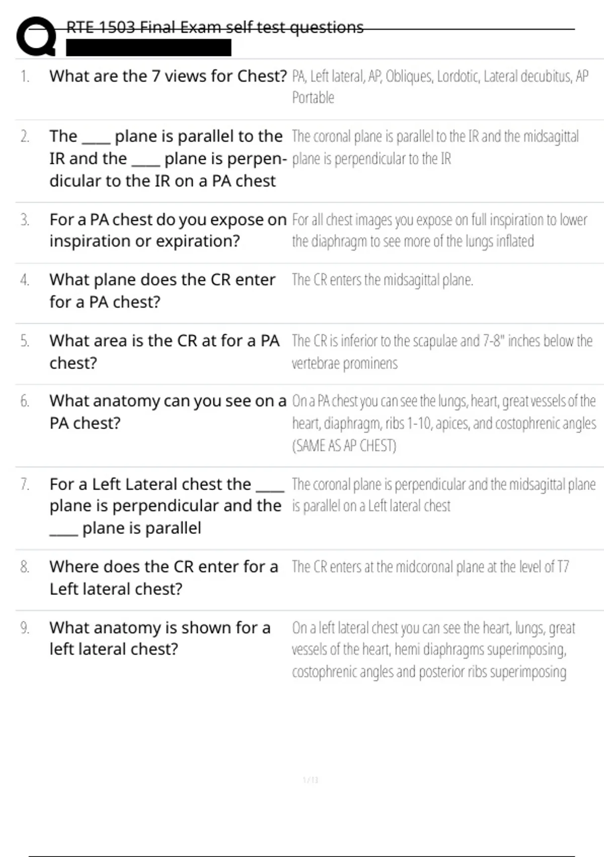 1. What are the 7 views for Chest? PA, Left lateral, AP, Obliques, Lordotic, Lateral decubitus, AP