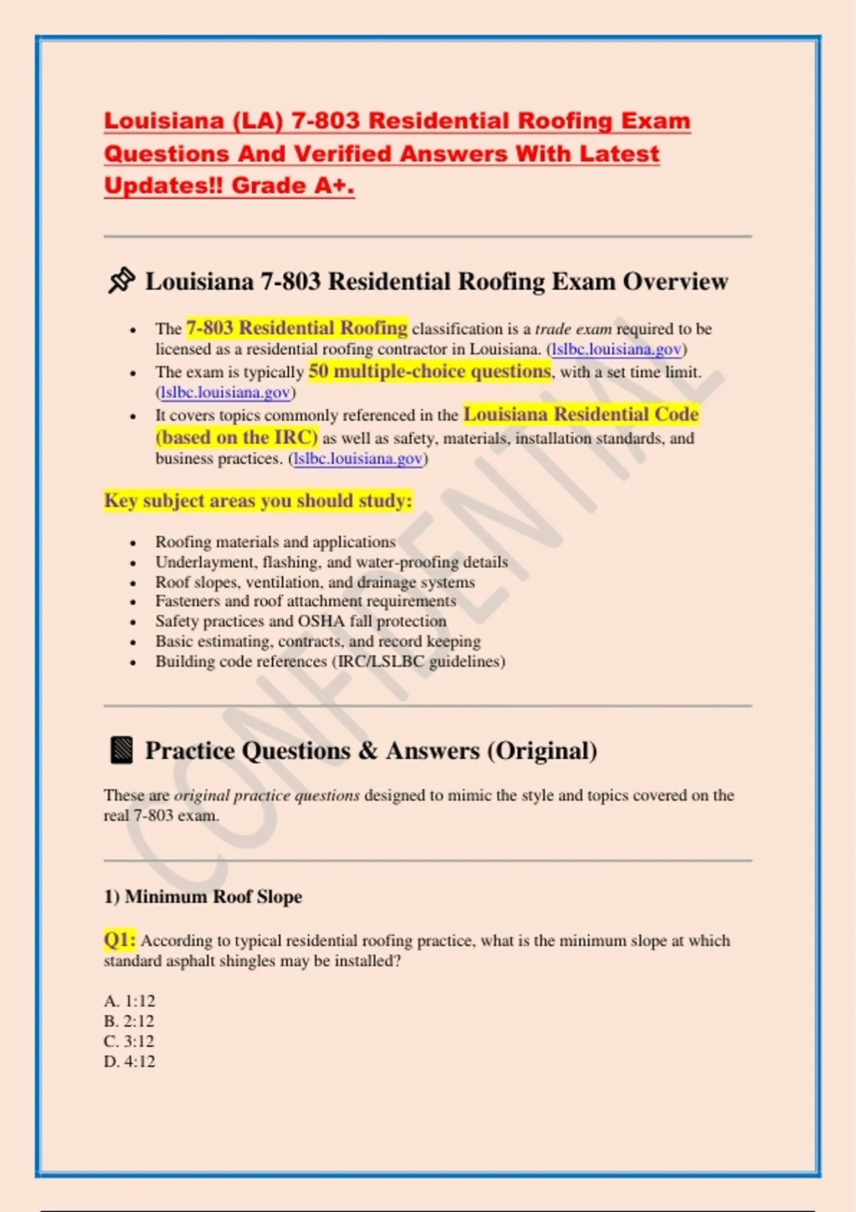Louisiana (LA) 7-803 Residential Roofing Exam Questions And Verified Answers With Latest Updates!! Grade A+.