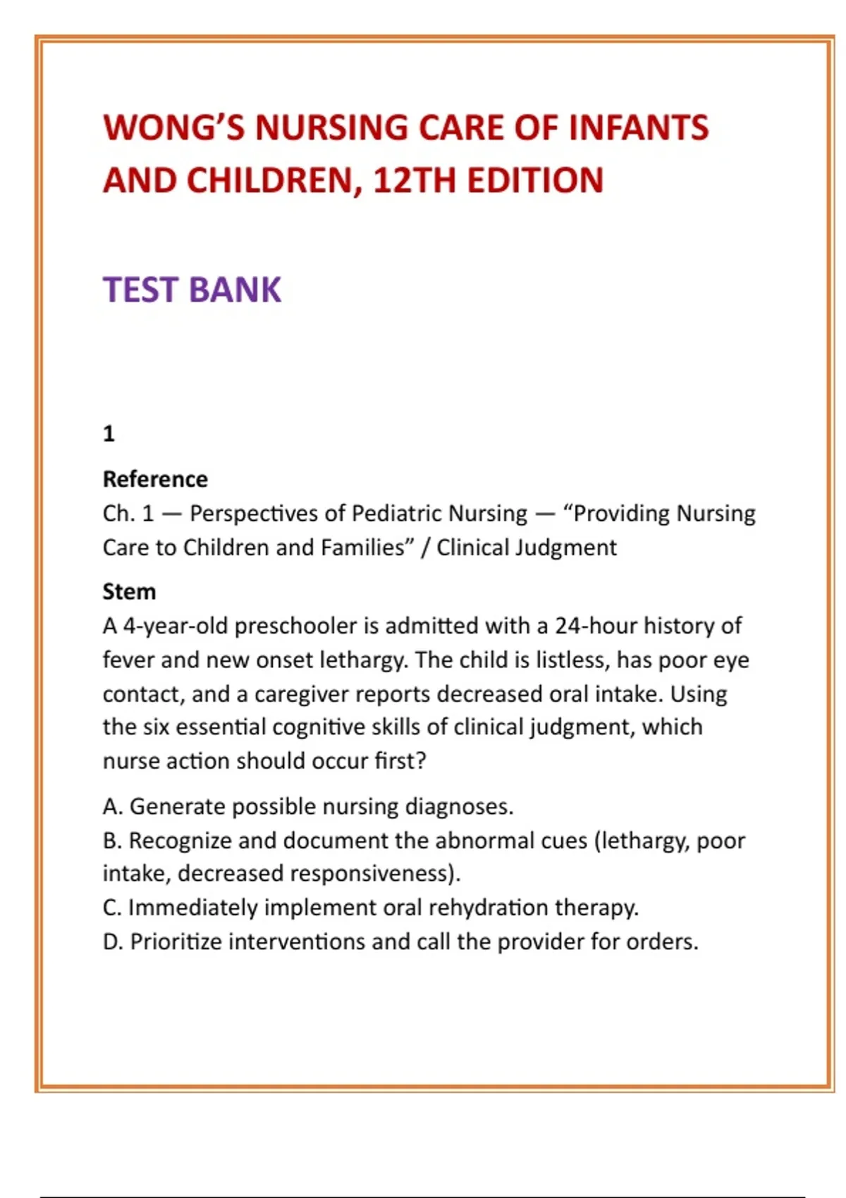 Wong’s Pediatric Nursing Test Bank (12th Ed) | Hockenberry NCLEX-Style MCQs & Pediatric Nursing Study Guide Description: Master pediatric nursing with confidence using this comprehensive Wong’s Nursing Care of Infants and Children, 12th Edition Test Bank—the gold-standard resource for child health nursing education worldwide. Designed for undergraduate and pre-licensure nursing students, this digital test bank delivers full chapter-by-chapter coverage with 20 high-quality NCLEX-style MCQs per chapter, each supported by clear, evidence-based rationales aligned to current exam standards. Every question is crafted to strengthen clinical judgment, pediatric assessment, and family-centered decision-making, helping learners distinguish sick vs. not sick children, recognize developmental red flags, and prioritize safe, age-appropriate interventions. Scenarios span growth and development, health promotion, acute and chronic pediatric conditions, medication safety, communication with families, and clinical prioritization, ensuring readiness for both coursework and licensure exams. This test bank is an efficient, time-saving study solution for students seeking higher scores, reduced test anxiety, and real-world pediatric competence. Built on Hockenberry’s Wong’s Nursing Care of Infants and Children, it reflects the language, frameworks, and evidence used by nursing programs globally—making it an ideal companion for exams and clinical preparation. Features include: Full textbook coverage — all units and chapters 20 NCLEX-style MCQs per chapter Verified correct answers with detailed rationales Pediatric clinical reasoning and safety-focused scenarios Coverage of growth & development, assessment, medications, and family-centered care Ideal for Pediatric Nursing, Child Health, Maternal–Child Health, and NCLEX-RN®/PN® prep Keywords: Wong pediatric nursing test bank Hockenberry pediatric nursing MCQs nursing care of infants and children test bank pediatric nursing study guide NCLEX pediatric nursing NCLEX-style questions child health nursing test bank maternal child nursing MCQs pediatric nursing exam preparation Hashtags: #PediatricNursing #WongPediatricNursing #Hockenberry #ChildHealthNursing #MaternalChildNursing #NCLEXPrep #NursingTestBank #PediatricNCLEX #NursingStudents #ClinicalJudgment