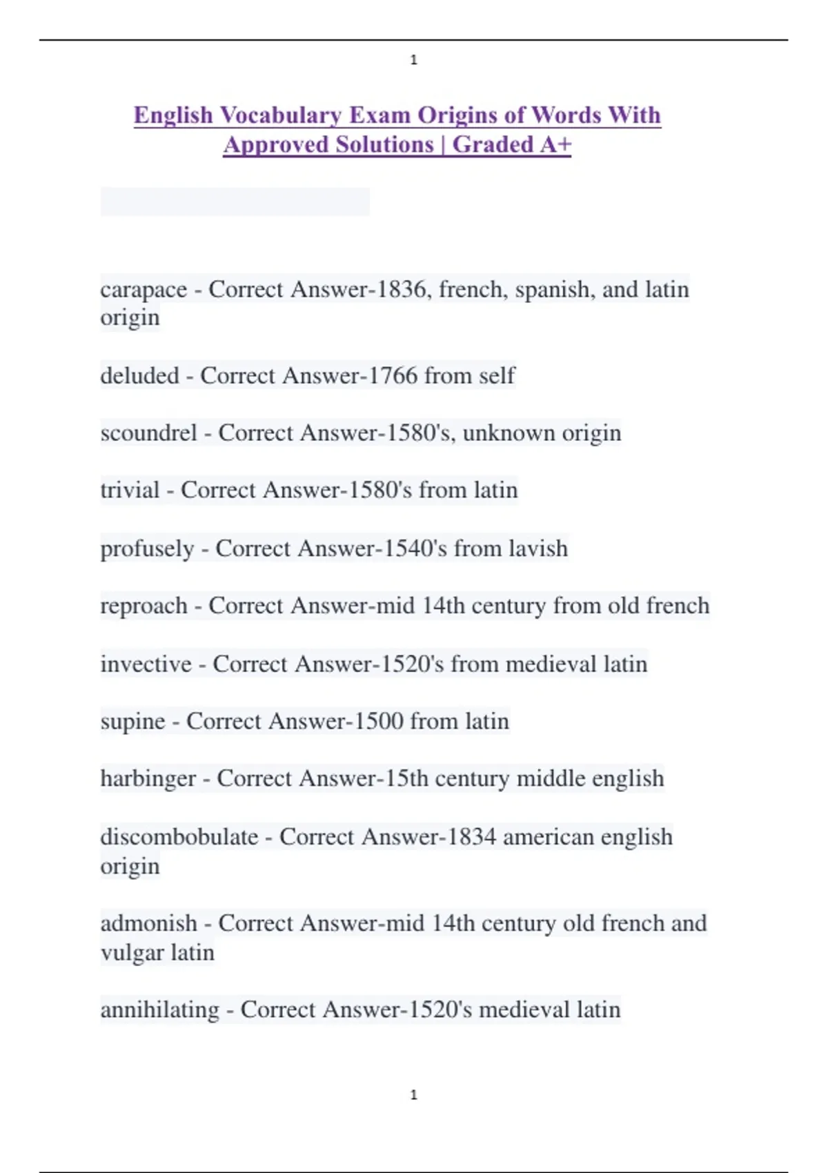 English Vocabulary Exam Origins of Words With