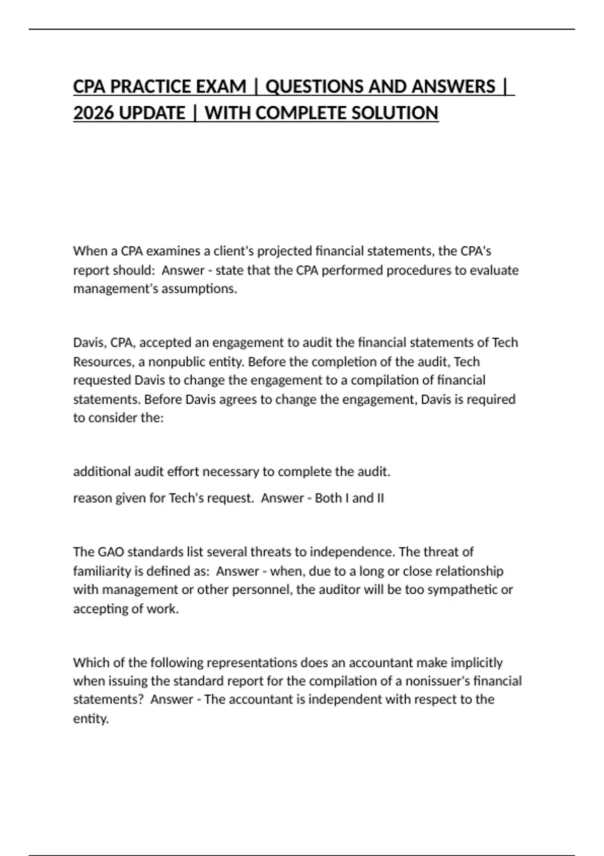 CPA PRACTICE EXAM | QUESTIONS AND ANSWERS | 2026 UPDATE | WITH COMPLETE SOLUTION