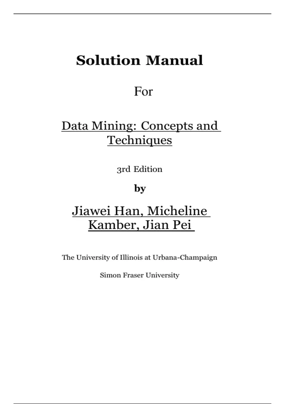 This document provides a complete solution manual for Data Mining: Concepts and Techniques, 3rd Edition by Jiawei Han, Micheline Kamber, and Jian Pei, covering Chapters 1–13 along with the bibliography. It includes clear explanations and step-by-step solutions for core data mining topics such as data preprocessing, data warehousing, association rule mining, classification, clustering, outlier analysis, and trend analysis, making it ideal for exams, assignments, and concept revision.