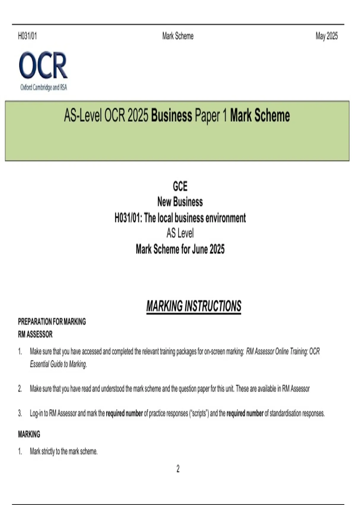 AS-Level OCR 2025 Business Paper 1 Mark Scheme
