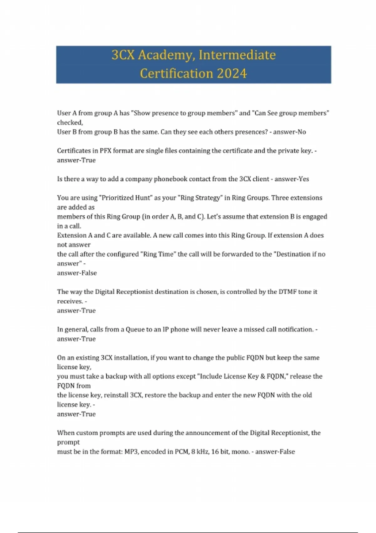 3CX Academy, Intermediate Certification 2024 User A from group A has "Show presence to group members" and "Can See group members" checked, User B from group B has the same. Can they see each others presences? - answer-No Certificates in PFX format are single files containing the certificate and the private key. - answer-True Is there a way to add a company phonebook contact from the 3CX client - answer-Yes You are using "Prioritized Hunt" as your "Ring Strategy" in Ring Groups. Three extensions are added as members of this Ring Group (in order A, B, and C). Let's assume that extension B is engaged in a call. Extension A and C are available. A new call comes into this Ring Group. If extension A does not answer the call after the configured "Ring Time" the call will be forwarded to the "Destination if no answer" - answer-False The way the Digital Receptionist destination is chosen, is controlled by the DTMF tone it receives. - answer-True In general, calls from a Queue to an IP phone will never leave a missed call notification. - answer-True On an existing 3CX installation, if you want to change the public FQDN but keep the same license key, you must take a backup with all options except "Include License Key & FQDN," release the FQDN from the license key, reinstall 3CX, restore the backup and enter the new FQDN with the old license key. - answer-True When custom prompts are used during the announcement of the Digital Receptionist, the prompt must be in the format: MP3, encoded in PCM, 8 kHz, 16 bit, mono. - answer-False