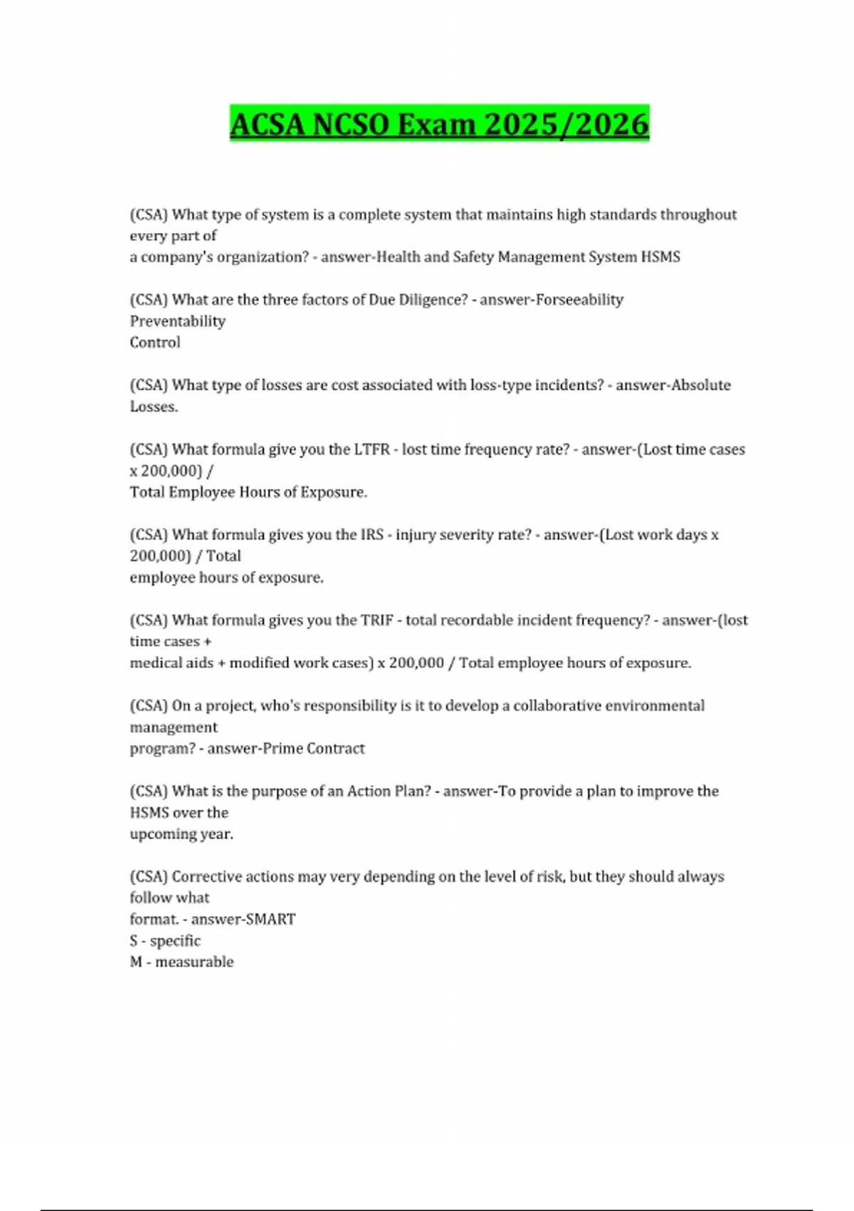 ACSA NCSO Exam 2025/2026 (CSA) What type of system is a complete system that maintains high standards throughout every part of a company's organization? - answer-Health and Safety Management System HSMS (CSA) What are the three factors of Due Diligence? - answer-Forseeability Preventability Control (CSA) What type of losses are cost associated with loss-type incidents? - answer-Absolute Losses. (CSA) What formula give you the LTFR - lost time frequency rate? - answer-(Lost time cases x 200,000) / Total Employee Hours of Exposure. (CSA) What formula gives you the IRS - injury severity rate? - answer-(Lost work days x 200,000) / Total employee hours of exposure. (CSA) What formula gives you the TRIF - total recordable incident frequency? - answer-(lost time cases + medical aids + modified work cases) x 200,000 / Total employee hours of exposure. (CSA) On a project, who's responsibility is it to develop a collaborative environmental management program? - answer-Prime Contract (CSA) What is the purpose of an Action Plan? - answer-To provide a plan to improve the HSMS over the upcoming year. (CSA) Corrective actions may very depending on the level of risk, but they should always follow what format. - answer-SMART S - specific M - measurable A - attainable R - relevant T - Time-bound (CSA) What helps to identify how