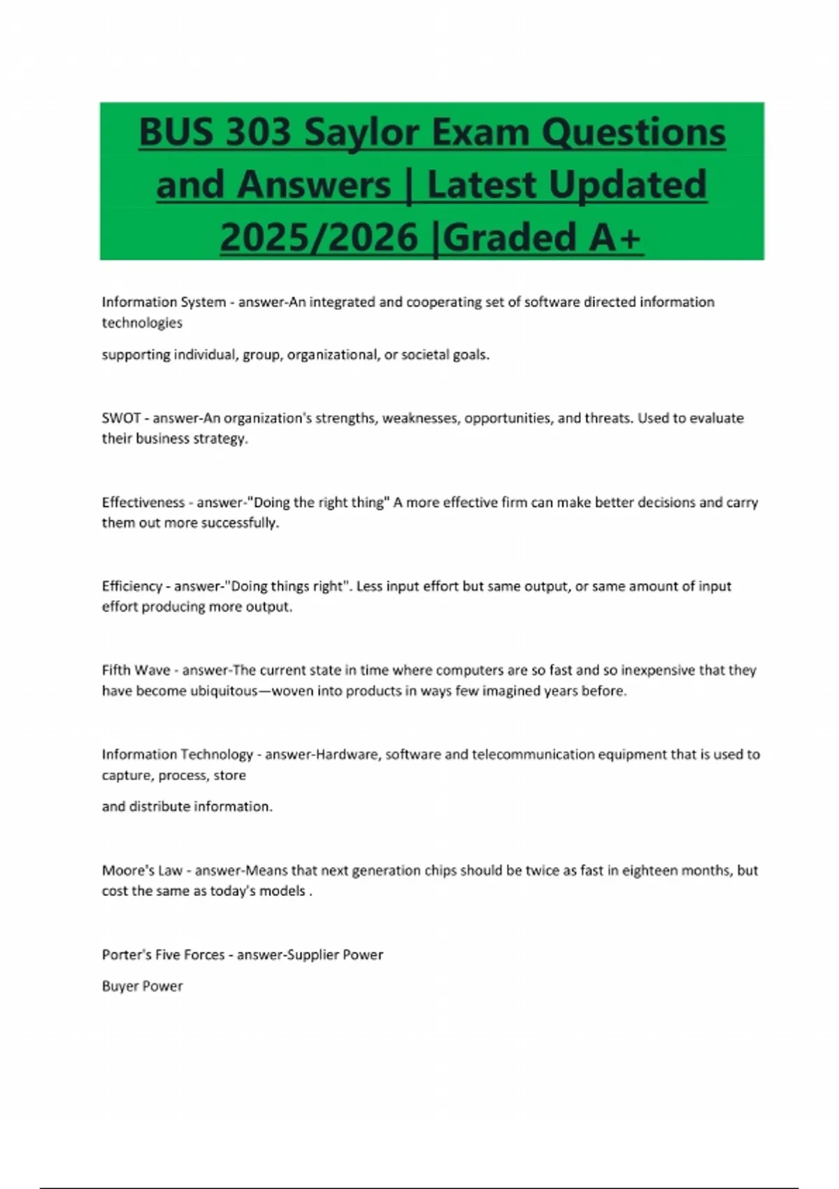 BUS 303 Saylor Exam Questions and Answers | Latest Updated 2025/2026 |Graded A+ Information System - answer-An integrated and cooperating set of software directed information technologies supporting individual, group, organizational, or societal goals. SWOT - answer-An organization's strengths, weaknesses, opportunities, and threats. Used to evaluate their business strategy. Effectiveness - answer-"Doing the right thing" A more effective firm can make better decisions and carry them out more successfully. Efficiency - answer-"Doing things right". Less input effort but same output, or same amount of input effort producing more output. Fifth Wave - answer-The current state in time where computers are so fast and so inexpensive that they have become ubiquitous—woven into products in ways few imagined years before. Information Technology - answer-Hardware, software and telecommunication equipment that is used to capture, process, store and distribute information. Moore's Law - answer-Means that next generation chips should be twice as fast in eighteen months, but cost the same as today's models . Porter's Five Forces - answer-Supplier Power Buyer PowerThreat of Substitution Threat of New Entry affect your Competitive Rivalvry Also known as Industry and Competitive Analysis. Regulatory Compliance - answer-An organization's adherence to laws, regulations, guidelines and specifications relevant to its business. Return on Investment - answer-Measures the amount of return on an investment, relative to the investment's cost