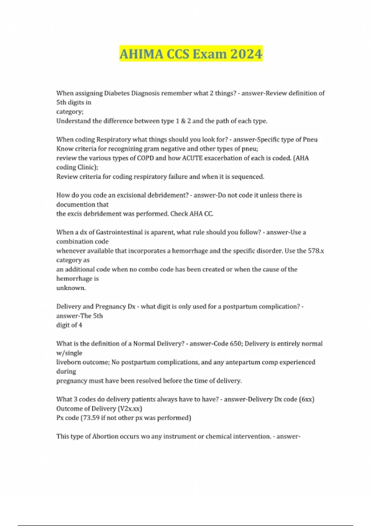 AHIMA CCS Exam 2024 When assigning Diabetes Diagnosis remember what 2 things? - answer-Review definition of 5th digits in category; Understand the difference between type 1 & 2 and the path of each type. When coding Respiratory what things should you look for? - answer-Specific type of Pneu Know criteria for recognizing gram negative and other types of pneu; review the various types of COPD and how ACUTE exacerbation of each is coded. (AHA coding Clinic); Review criteria for coding respiratory failure and when it is sequenced. How do you code an excisional debridement? - answer-Do not code it unless there is documention that the excis debridement was performed. Check AHA CC. When a dx of Gastrointestinal is aparent, what rule should you follow? - answer-Use a combination code whenever available that incorporates a hemorrhage and the specific disorder. Use the 578.x category as an additional code when no combo code has been created or when the cause of the hemorrhage is unknown. Delivery and Pregnancy Dx - what digit is only used for a postpartum complication? - answer-The 5th digit of 4 What is the definition of a Normal Delivery? - answer-Code 650; Delivery is entirely normal w/single liveborn outcome; No postpartum complications, and any antepartum comp experienced during pregnancy must have been resolved before the time of delivery. What 3 codes do delivery patients always have to have? - answer-Delivery Dx code (6xx) Outcome of Delivery (V) Px code (73.59 if not other px was performed) This type of Abortion occurs wo any instrument or chemical intervention. - answer Spontaneous (634)