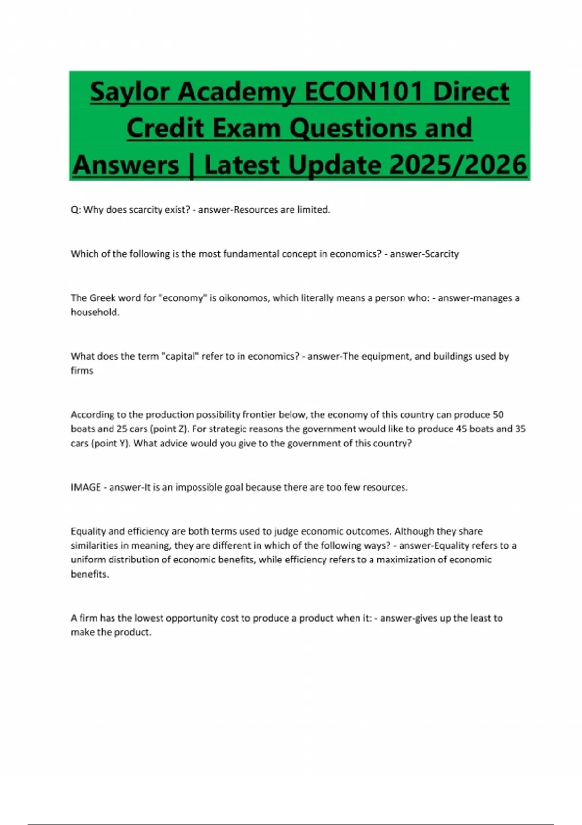 Saylor Academy ECON101 Direct Credit Exam Questions and Answers | Latest Update 2025/2026 Q: Why does scarcity exist? - answer-Resources are limited. Which of the following is the most fundamental concept in economics? - answer-Scarcity The Greek word for "economy" is oikonomos, which literally means a person who: - answer-manages a household. What does the term "capital" refer to in economics? - answer-The equipment, and buildings used by firms According to the production possibility frontier below, the economy of this country can produce 50 boats and 25 cars (point Z). For strategic reasons the government would like to produce 45 boats and 35 cars (point Y). What advice would you give to the government of this country? IMAGE - answer-It is an impossible goal because there are too few resources. Equality and efficiency are both terms used to judge economic outcomes. Although they share similarities in meaning, they are different in which of the following ways? - answer-Equality refers to a uniform distribution of economic benefits, while efficiency refers to a maximization of economic benefits. A firm has the lowest opportunity cost to produce a product when it: - answer-gives up the least to make the product.In the circular flow model, what are the two main groups of actors in the economy? What are the two markets that make up the economy? - answer-The main groups of actors are households and firms, and the two markets are the goods/services market and the market for the factors of production.