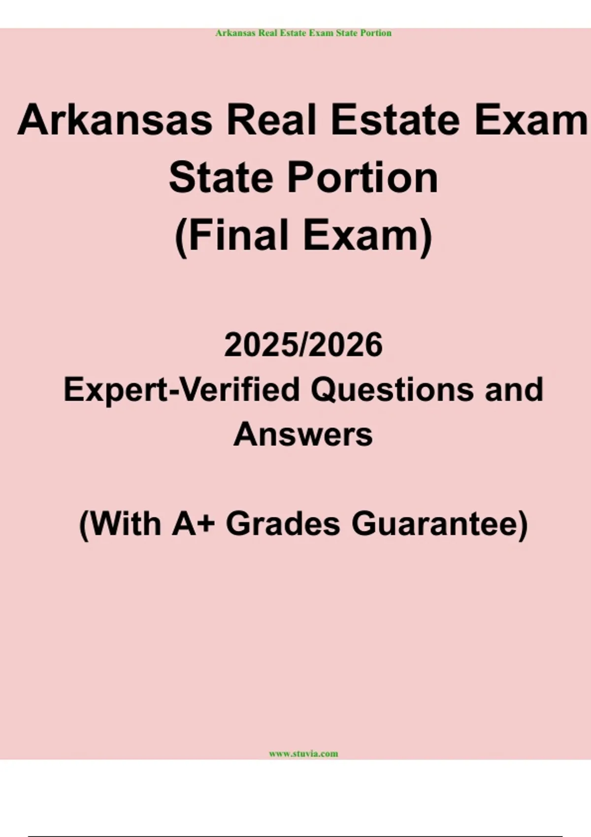 This Arkansas Real Estate Exam – State Portion prep resource provides focused coverage of Arkansas property law, contracts, real estate regulations, and practice questions, helping candidates efficiently prepare for the state portion of the Arkansas real estate licensing exam.