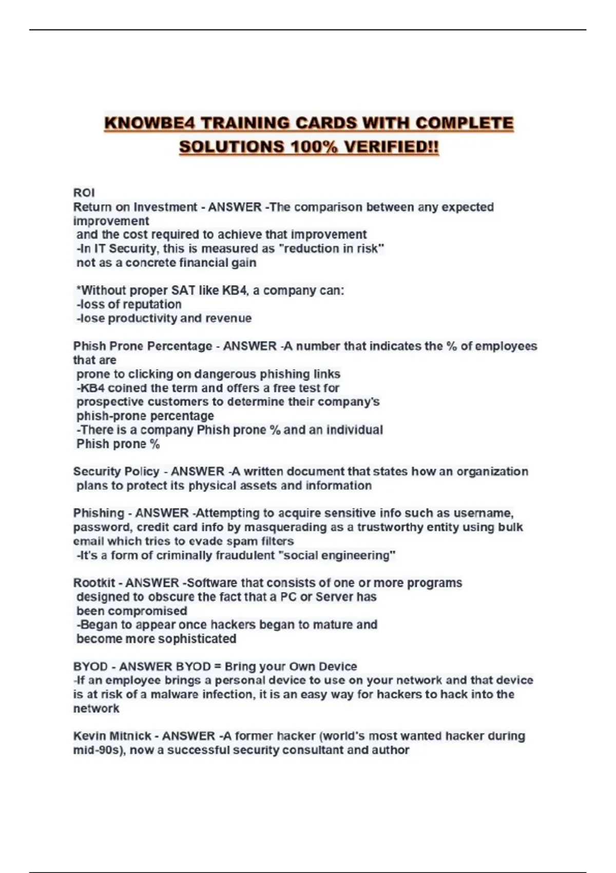 KNOWBE4 TRAINING CARDS WITH COMPLETE SOLUTIONS 100% VERIFIED!!...