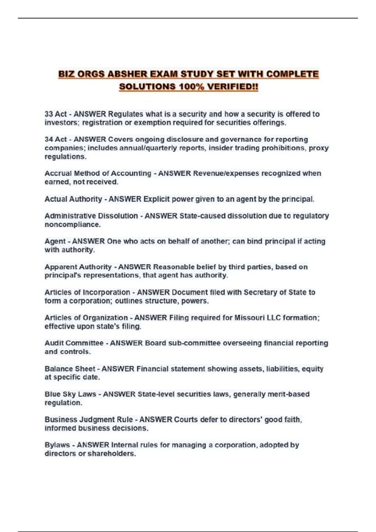 BIZ ORGS ABSHER EXAM STUDY SET WITH COMPLETE SOLUTIONS 100% VERIFIED!!...