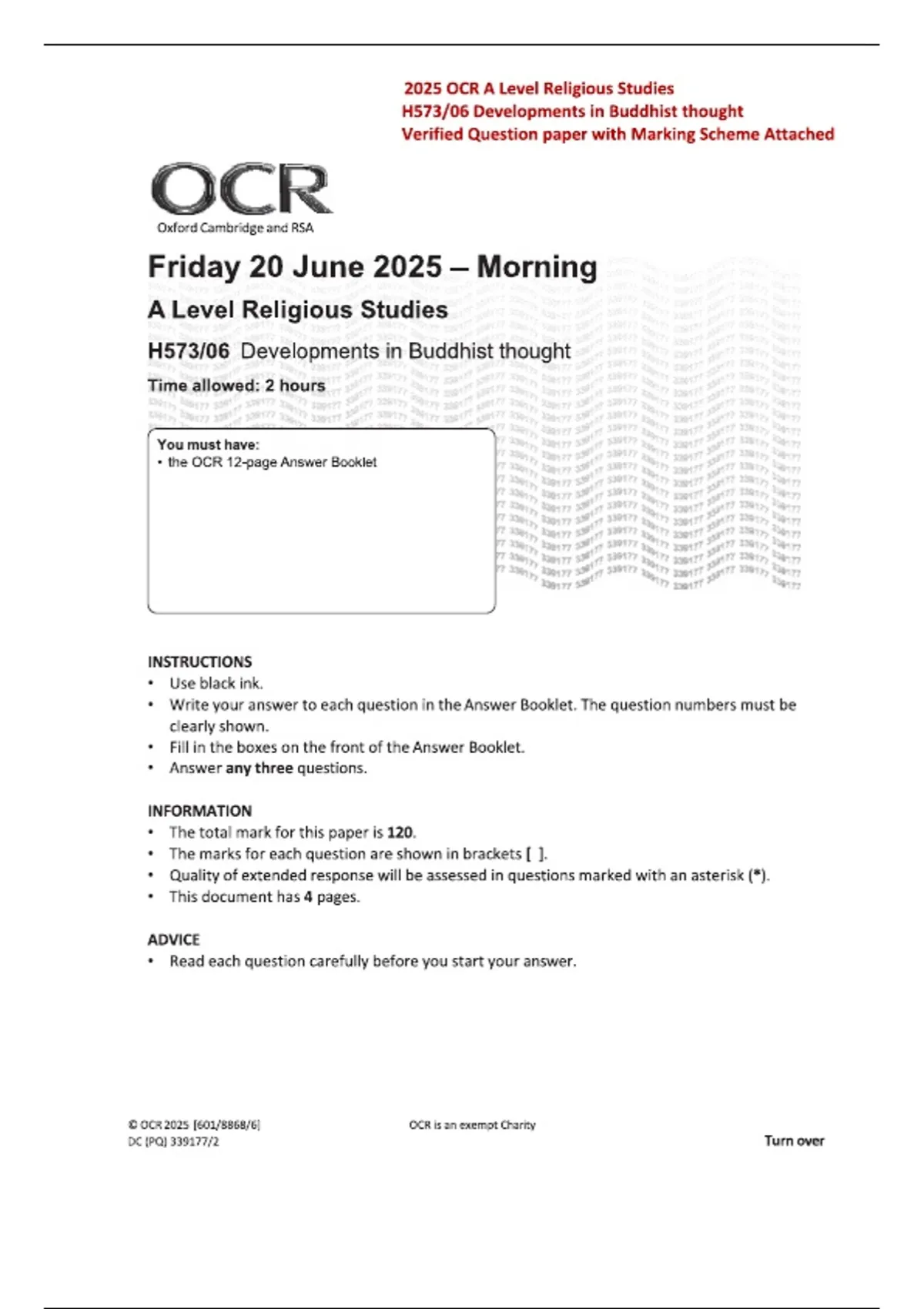 Official 2025 OCR A Level Religious Studies H573/06 resource featuring the verified question paper and attached marking scheme. Covers developments in Buddhist thought, key teachings, historical context, ethical practices, and philosophical interpretations, ideal for structured exam preparation, academic revision, and performance evaluation.