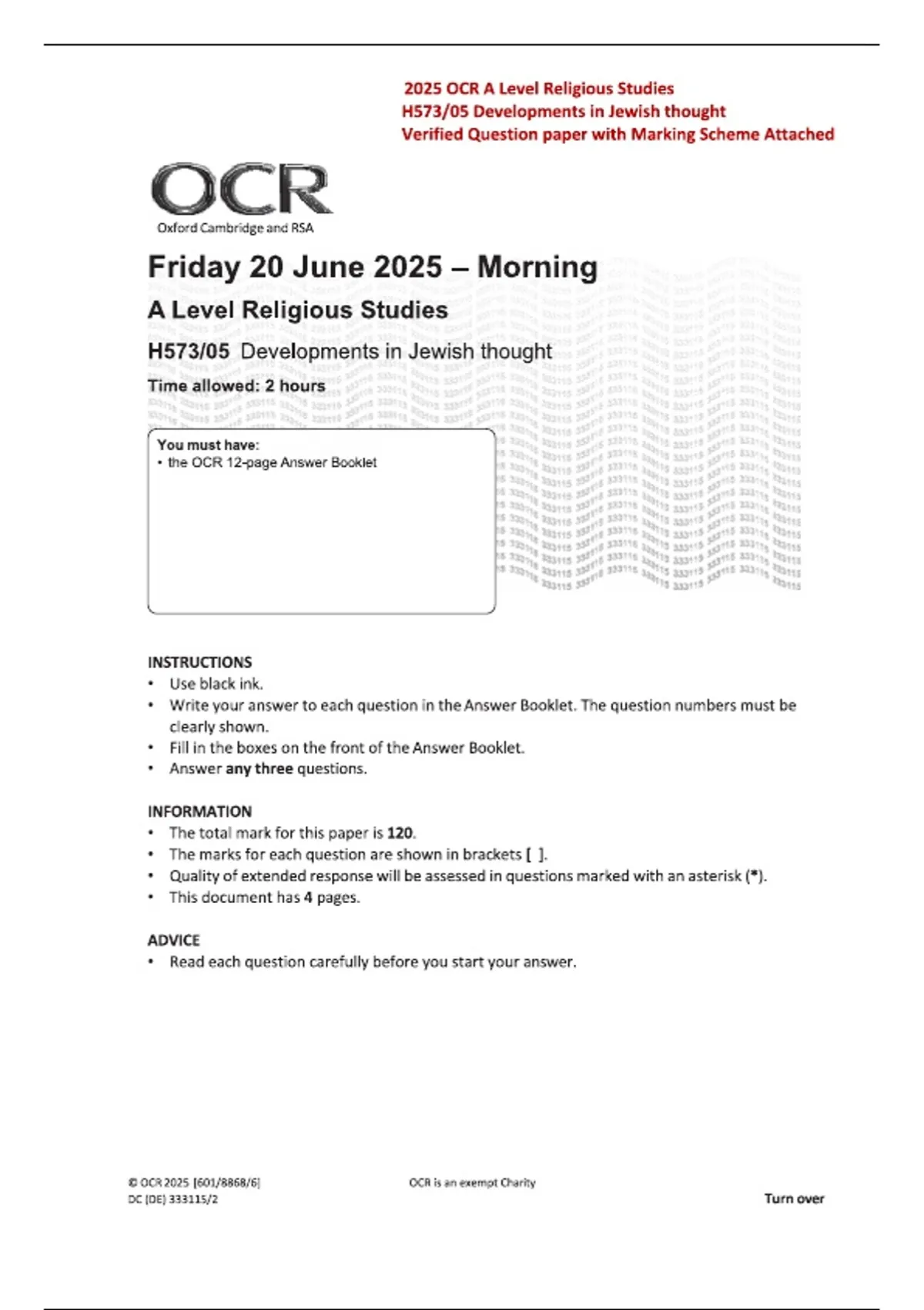 Official 2025 OCR A Level Religious Studies H573/05 resource featuring the verified question paper with attached marking scheme. Covers developments in Jewish thought, key beliefs, historical context, ethical teachings, and philosophical interpretations, ideal for exam preparation, academic revision, and performance evaluation.