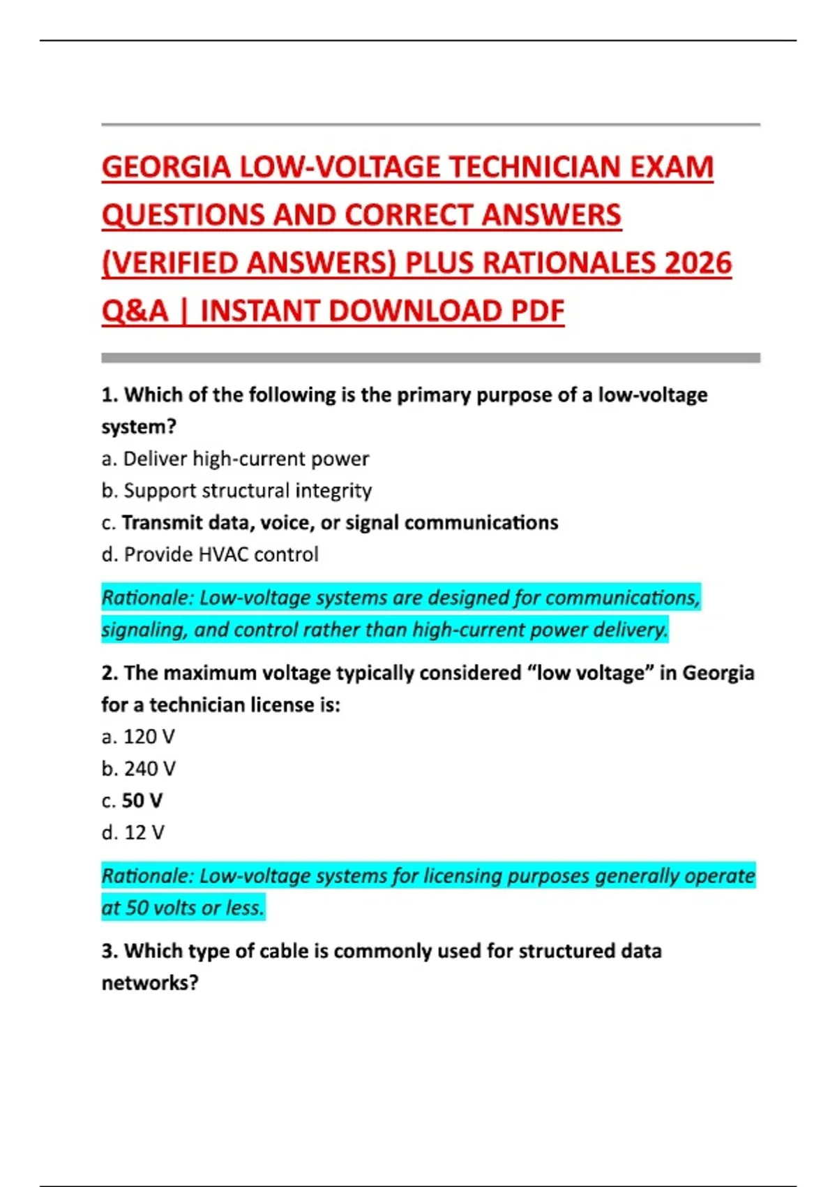Prepare and excel in the Georgia Low-Voltage Technician Exam with this comprehensive guide featuring verified questions and correct answers. Fully updated for 2026/2027, this resource helps candidates review key low-voltage systems, licensing requirements, and exam concepts to boost confidence and achieve top scores. Perfect for focused study and licensing exam success.