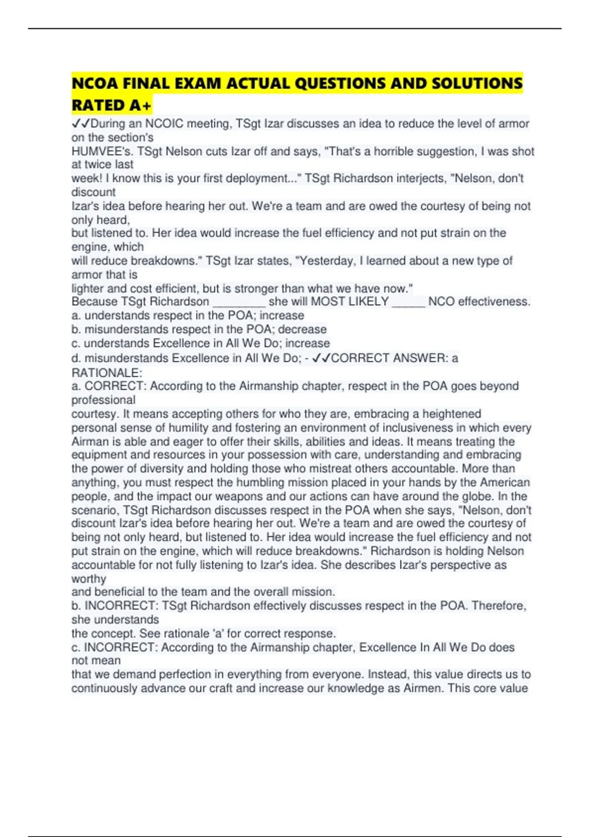 NCOA FINAL EXAM ACTUAL QUESTIONS AND SOLUTIONS RATED A+