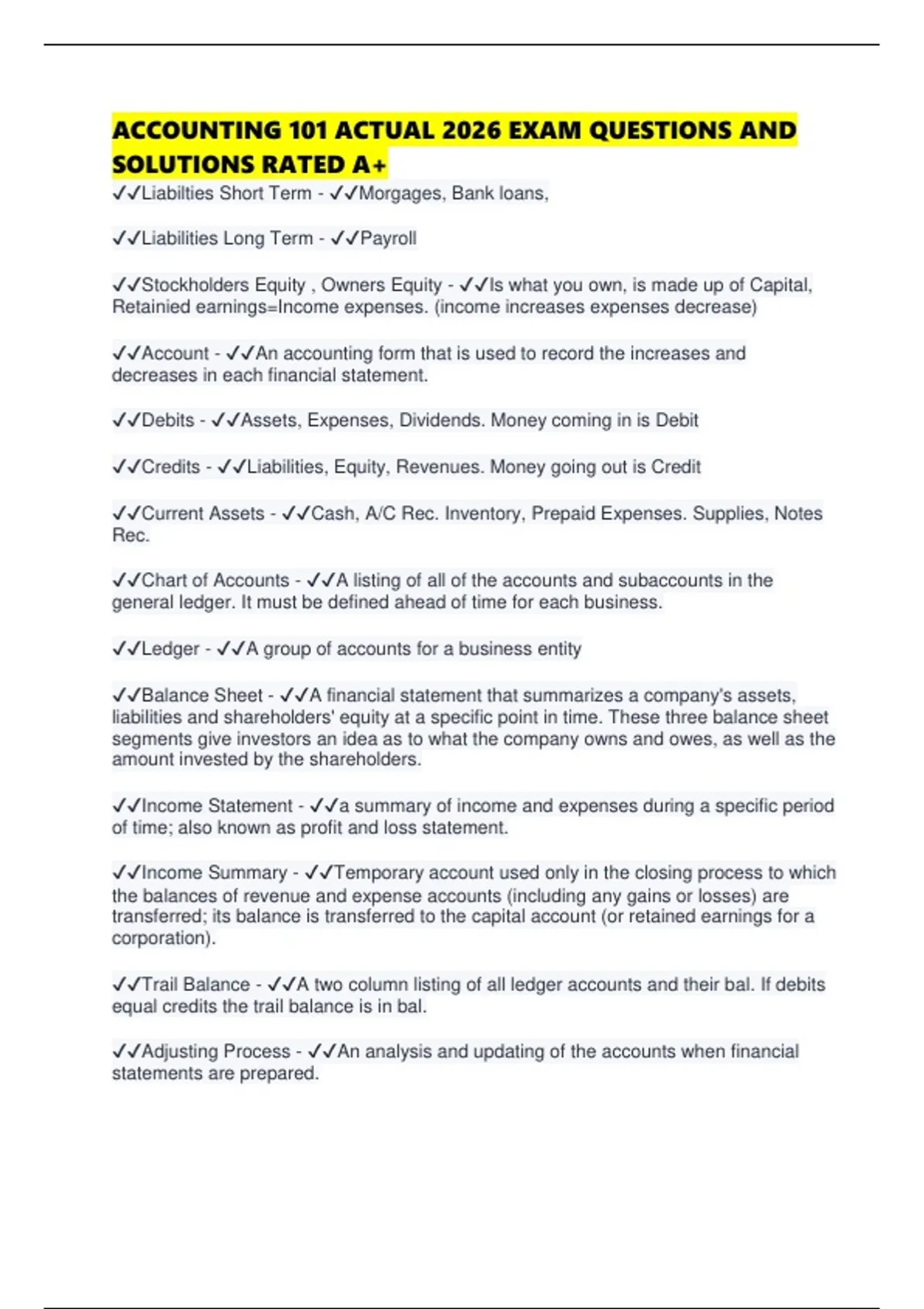 ✔✔Balance Sheet - ✔✔A financial statement that summarizes a company's assets,