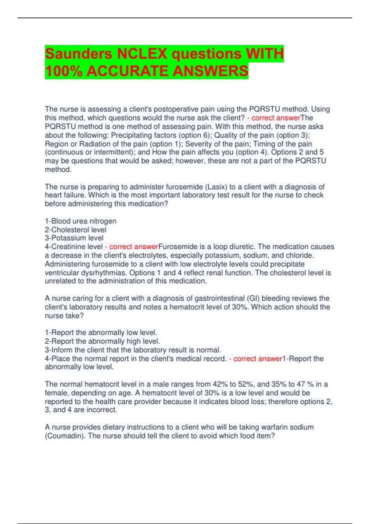 This Saunders NCLEX Questions – With 100% Accurate Answers PDF is a comprehensive, exam-focused study resource designed to help nursing candidates master the NCLEX-RN and NCLEX-PN exams with confidence. Updated to reflect the Latest 2026 NCLEX test plan, this resource includes Saunders-style practice questions with fully verified, 100% accurate answers, covering Next Gen NCLEX (NGN) clinical judgment, prioritization, delegation, pharmacology, medical-surgical nursing, maternal-newborn, pediatrics, mental health, and patient safety. Graded A+, this guide emphasizes accuracy, reliability, and exam alignment, making it ideal for daily practice, readiness assessment, and final NCLEX review. What’s Included: ️ Saunders-style NCLEX practice questions ️ 100% accurate answers for confident learning ️ Coverage of all major NCLEX content areas ️ NGN-style questions to enhance clinical judgment ️ Professionally formatted PDF ️ Latest Update 2026 ️ Graded A+ for quality and reliability Ideal For: Nursing students preparing for NCLEX-RN or NCLEX-PN Candidates using Saunders NCLEX Review as their study tool First-time test takers aiming for NCLEX success Efficient self-testing, revision, and exam confidence building Download now and master your NCLEX preparation with this trusted A+ Saunders-style study guide.