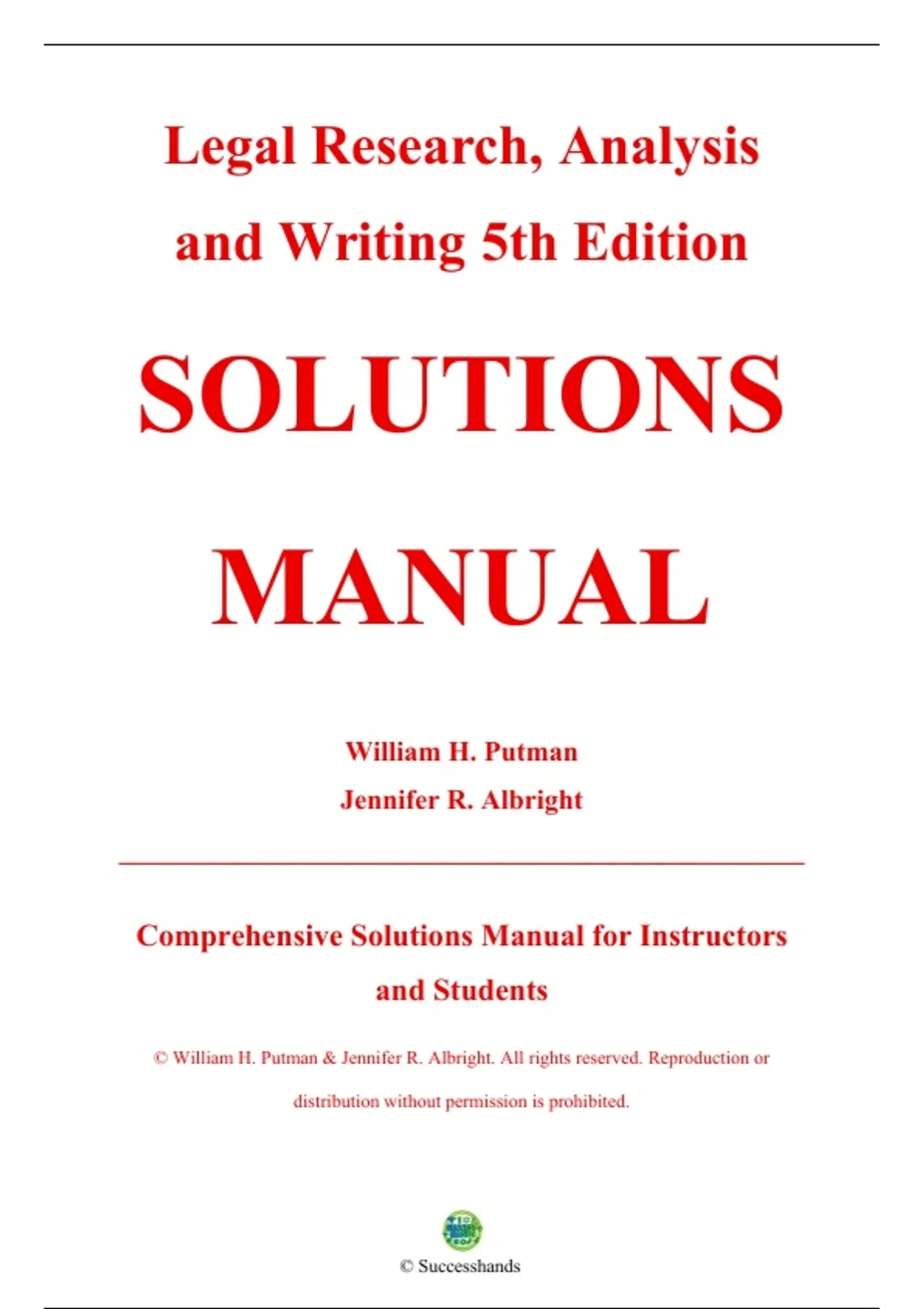 Complete Solutions Manual — Legal Research, Analysis, and Writing, 5th Edition — William H. Putman — ISBN 9780357619445 — (All Chapters Covered 1–19, Solutions Included). Chapters included: Chapter 1 Introduction to Legal Principles and Authorities, Chapter 2 Introduction to Legal Research and Analysis, Chapter 3 Constitutions, Statutes, Administrative Law, and Court Rules—Research and Analysis, Chapter 4 Case Law—Research and Briefing, Chapter 5 Secondary Authority and Other Research Sources—Encyclopedias, Treatises, American Law Reports, Digests, Shepard’s, Chapter 6 Secondary Authority—Periodicals, Restatements, Uniform Laws, Dictionaries, Legislative History, and Other Secondary Authorities, Chapter 7 Computers and Internet Legal Research, Chapter 8 Commercial Internet Research, Chapter 9 Legal Analysis—Key Facts, Chapter 10 Legal Analysis: Issue Identification—Spotting the Issue, Chapter 11 Legal Analysis: Stating the Issue, Chapter 12 Case Law Analysis—Is a Case on Point?, Chapter 13 Counteranalysis, Chapter 14 Fundamentals of Writing, Chapter 15 The Writing Process for Effective Legal Writing, Chapter 16 Office Legal Memorandum: Issues and Facts, Chapter 17 Office Legal Memorandum: Analysis to Conclusion, Chapter 18 External Memoranda: Court Briefs, Chapter 19 Correspondence.