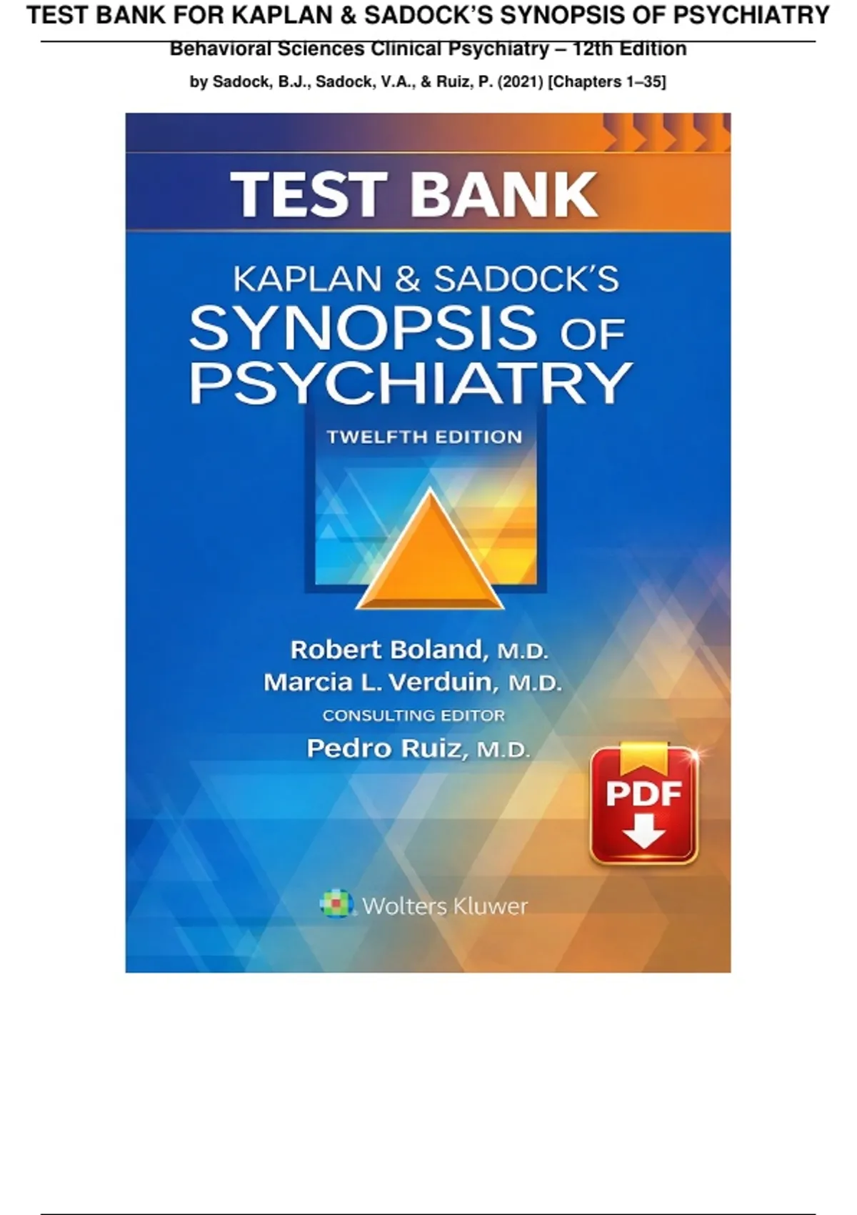 (All Chapters 1-35) This test bank covers the full scope of Kaplan & Sadock’s Synopsis of Psychiatry, 12th Edition, focusing on behavioral sciences and clinical psychiatry. It includes exam-style practice questions designed to test understanding of psychiatric disorders, diagnostic criteria, assessment methods, and treatment approaches. The material is suitable for medical students and psychiatry trainees preparing for exams or reinforcing key concepts from the textbook. All chap