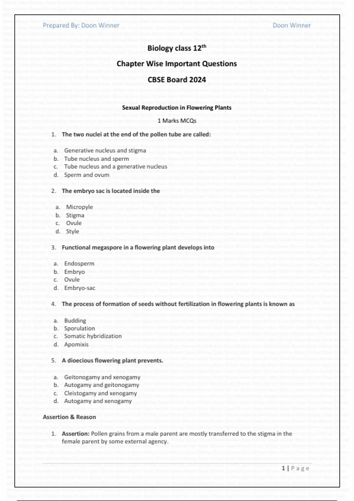 1. Assertion: Pollen grains from a male parent are mostly transferred to the stigma in the