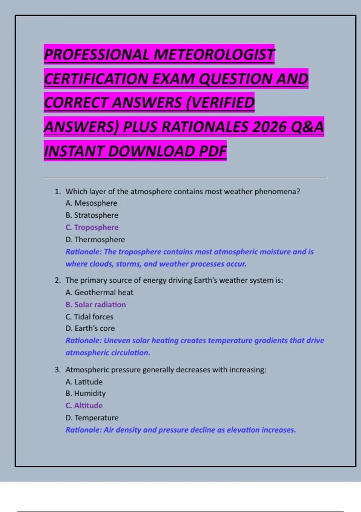 PROFESSIONAL METEOROLOGIST CERTIFICATION EXAM QUESTION AND CORRECT ANSWERS (VERIFIED ANSWERS) PLUS RATIONALES 2026 Q&A INSTANT DOWNLOAD PDF