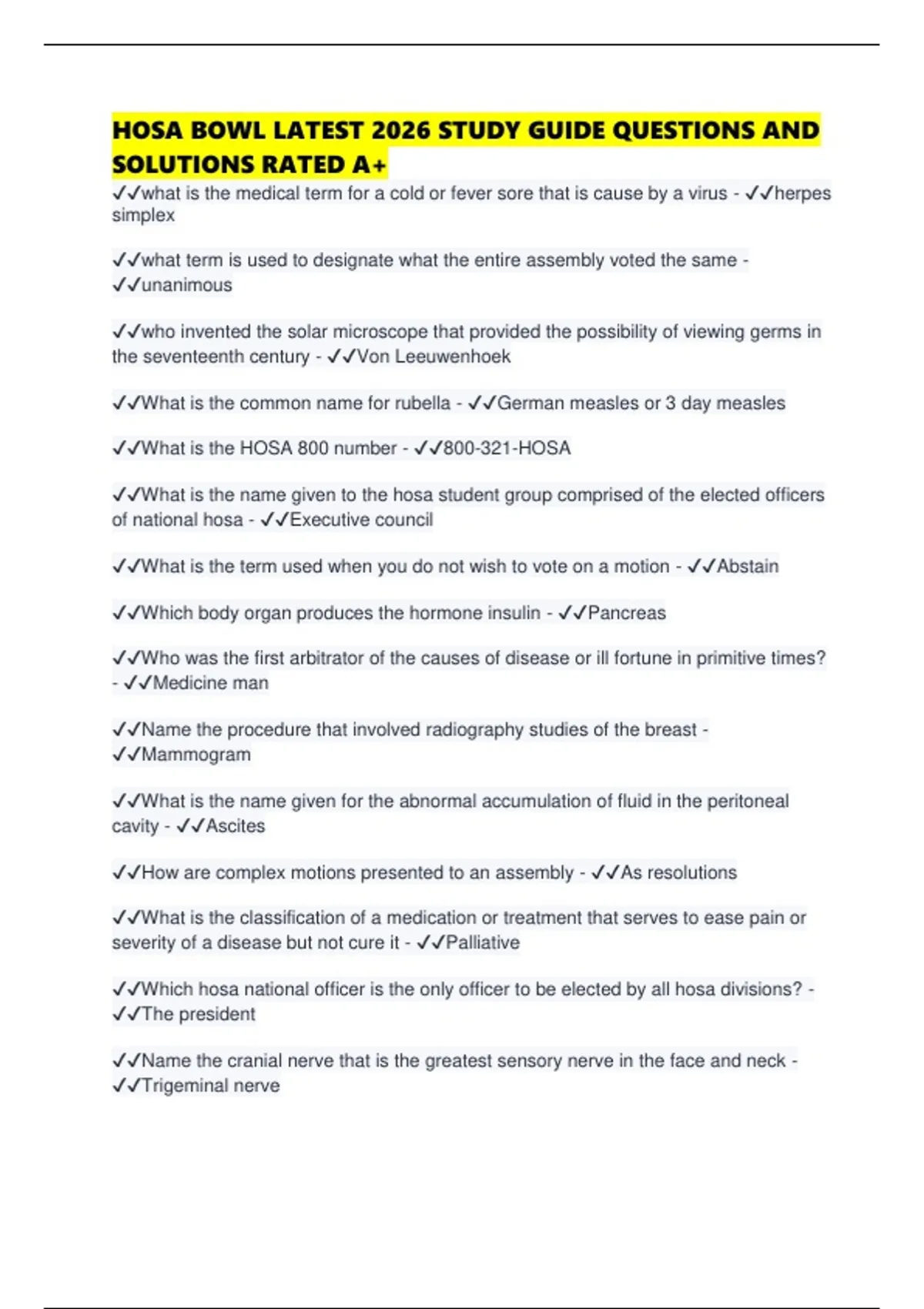 HOSA BOWL LATEST 2026 STUDY GUIDE QUESTIONS AND SOLUTIONS RATED A+