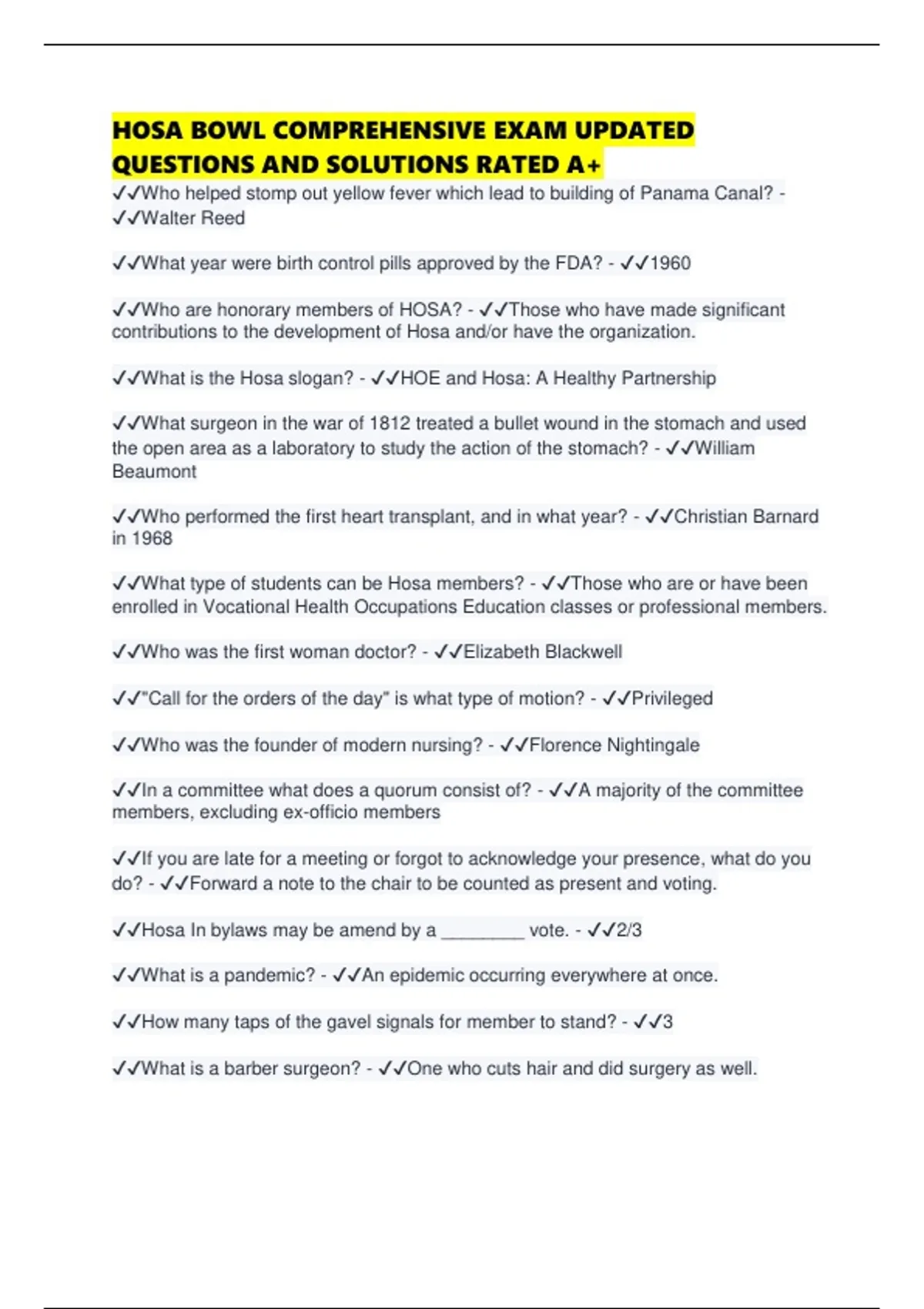 HOSA BOWL COMPREHENSIVE EXAM UPDATED QUESTIONS AND SOLUTIONS RATED A+