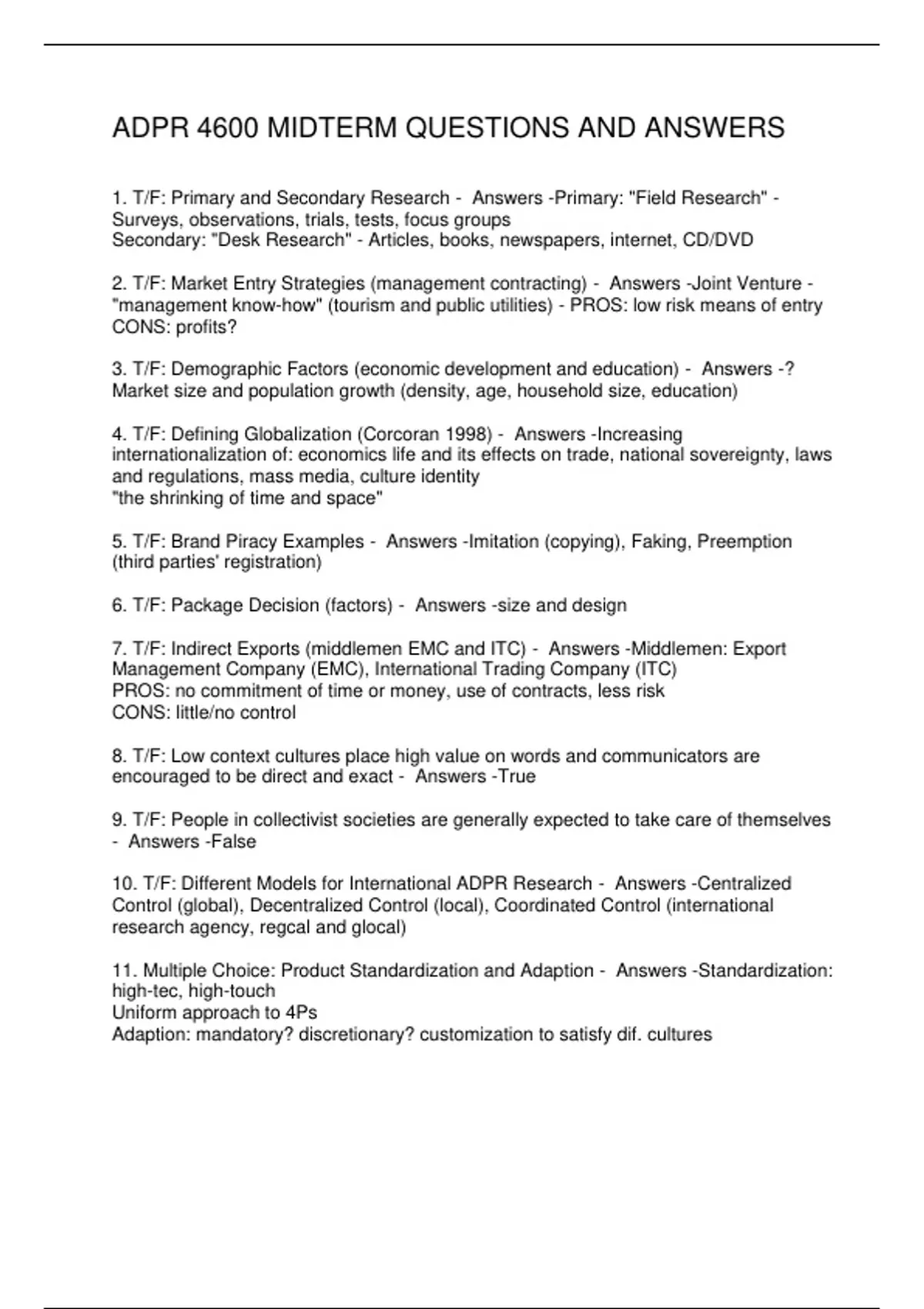 11. Multiple Choice: Product Standardization and Adaption - Answers -Standardization: