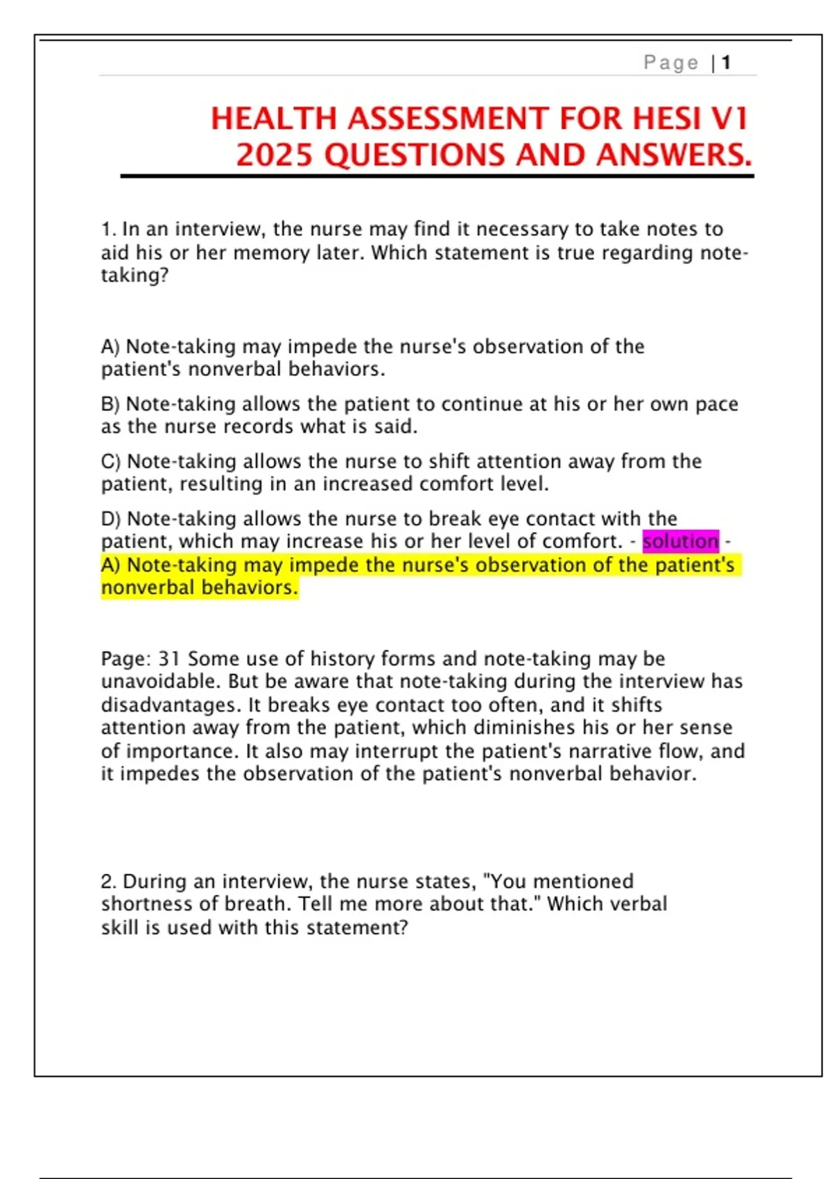 1. In an interview, the nurse may find it necessary to take notes to