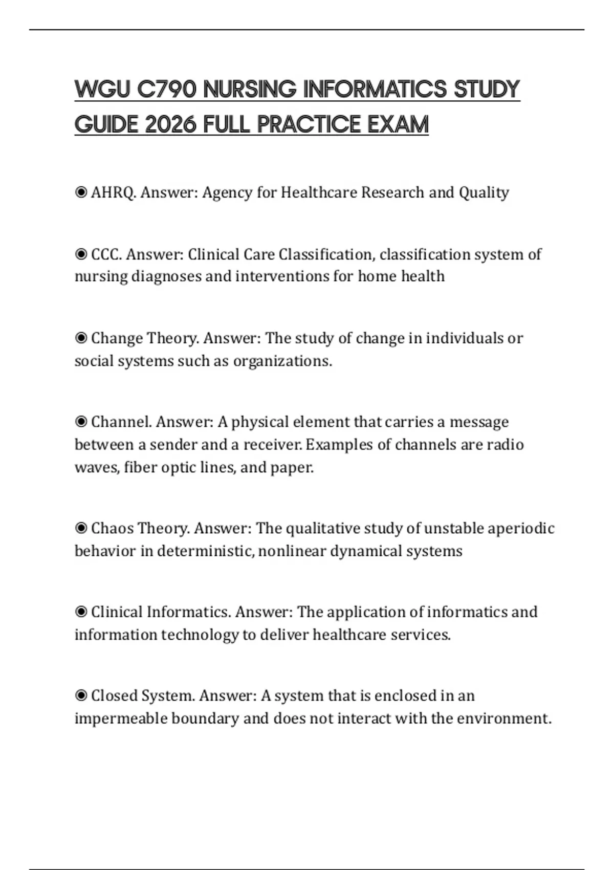 WGU C790 NURSING INFORMATICS STUDY GUIDE 2026 FULL PRACTICE EXAM