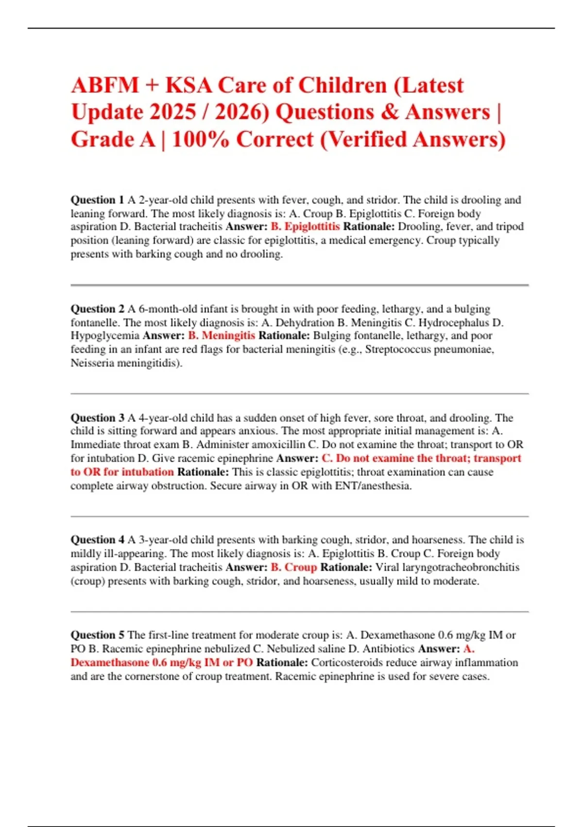 This document contains real ABFM Knowledge Self-Assessment (KSA) Care of Children questions from the latest 2025/2026 update, with verified and 100% correct answers. It covers pediatric preventive care, growth and development, common childhood conditions, immunizations, and evidence-based clinical decision-making. The material reflects real KSA-style questions used by the ABFM to support accurate and effective preparation.