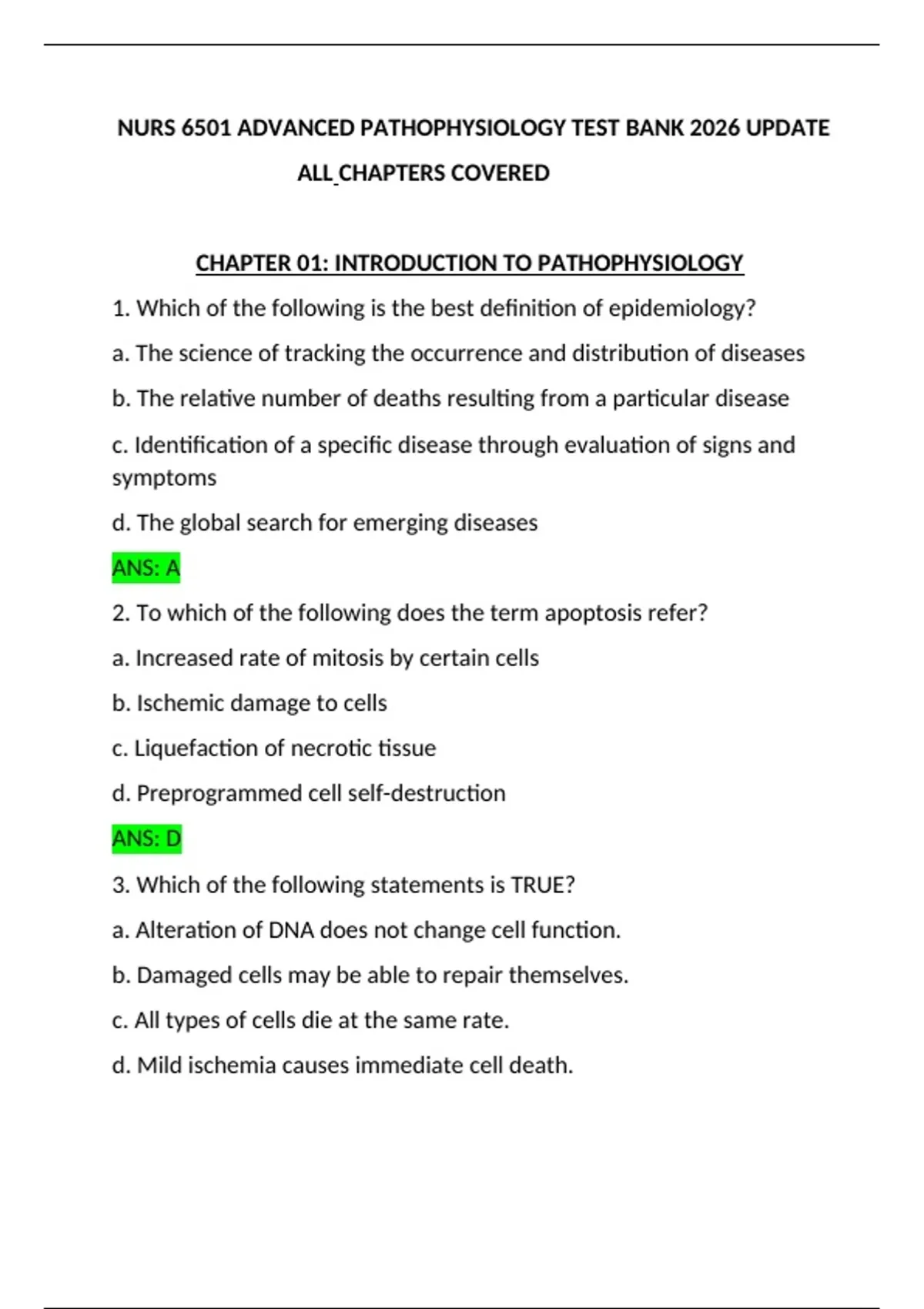 NURS 6501 ADVANCED PATHOPHYSIOLOGY EXAM TEST BANK 2026 LATEST UPDATE WITH ALL CHAPTERS COVERED| VERIFIED & ACCURATE ANSWERS| GUARANTEED SUCCESS