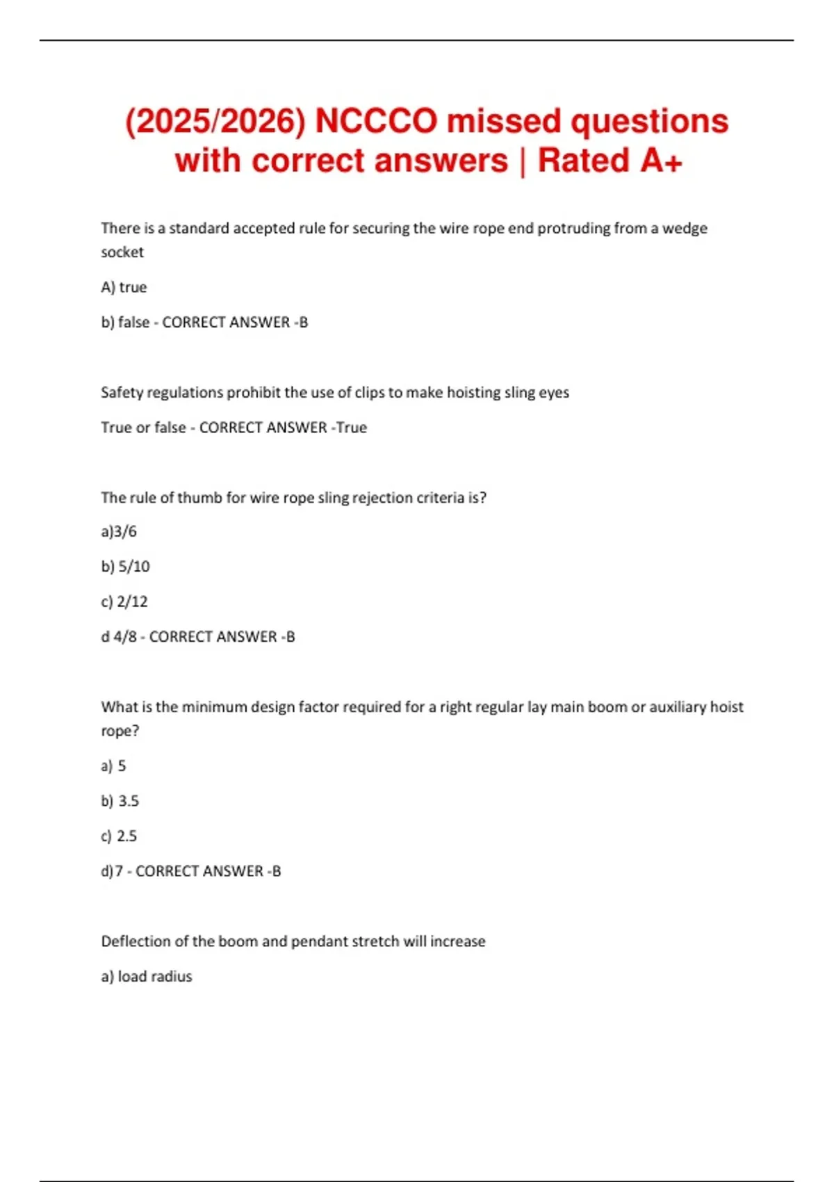 Excel in your crane operator certification with the (2025/2026) NCCCO Missed Questions and Correct Answers study resource. This expertly curated guide focuses on the most challenging topics, including wire rope sling rejection criteria (5/10 rule), minimum design factors for hoist ropes, and boom deflection effects on load radius. Master complex technical requirements such as the ASME B30.5 standards for hand signals, proper hydraulic boom extension precautions, and the strategic use of blocking under crawler tracks to maximize stability during front or back operations. Whether you are studying for the Core exam or a specialty crane certification, these A+ rated answers provide the technical depth needed to navigate difficult questions on crane operating control regulations and wedge socket safety.