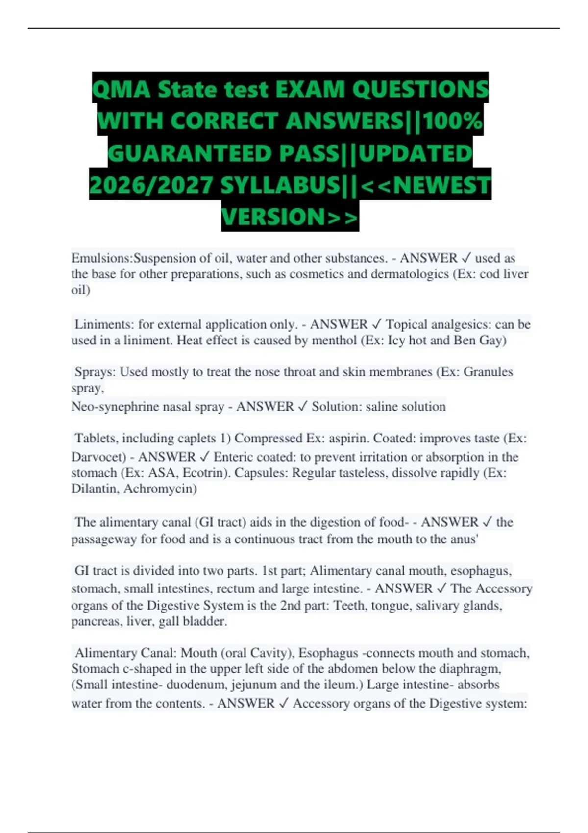 QMA State test EXAM QUESTIONS WITH CORRECT ANSWERS||100% GUARANTEED PASS||UPDATED 2026/2027 SYLLABUS||NEWEST VERSION Emulsions:Suspension of oil, water and other substances. - ANSWER used as the base for other preparations, such as cosmetics and dermatologics (Ex: cod liver oil) Liniments: for external application only. - ANSWER Topical analgesics: can be used in a liniment. Heat effect is caused by menthol (Ex: Icy hot and Ben Gay) Sprays: Used mostly to treat the nose throat and skin membranes (Ex: Granules spray, Neo-synephrine nasal spray - ANSWER Solution: saline solution Tablets, including caplets 1) Compressed Ex: aspirin. Coated: improves taste (Ex: Darvocet) - ANSWER Enteric coated: to prevent irritation or absorption in the stomach (Ex: ASA, Ecotrin). Capsules: Regular tasteless, dissolve rapidly (Ex: Dilantin, Achromycin) The alimentary canal (GI tract) aids in the digestion of food- - ANSWER the passageway for food and is a continuous tract from the mouth to the anus' GI tract is divided into two parts. 1st part; Alimentary canal mouth, esophagus, stomach, small intestines, rectum and large intestine. - ANSWER The Accessory organs of the Digestive System is the 2nd part: Teeth, tongue, salivary glands, pancreas, liver, gall bladder. Alimentary Canal: Mouth (oral Cavity), Esophagus -connects mouth and stomach, Stomach c-shaped in the upper left side of the abdomen below the diaphragm, (Small intestine- duodenum, jejunum and the ileum.) Large intestine- absorbs water from the contents. - ANSWER Accessory organs of the Digestive system: Teeth, salivary glands, (pancreas -small gland located behind the stomach upper left side-secretes insulin a hormone that is necessary to metabolize (use) sugar) (liver- highly vascular organ located in the upper right of the abdomen- secretes digestive substances,) (gallbladder-located behind the liver- stores bile from the liver until it is needed for digestion of fat- it is green) Many medications are metabolized in the liver, - ANSWER The digestive System is a system that works to break down the chemical components of food through the of digestive juices. The digestive process begins in the mouth with the teeth that grind the food int small particles. - ANSWER Disorders of the GI system-Cirrhosis- scar tissue replaces normal tissue, constipation, Diarrhea, Dyspepsia- indigestion, GERD, fecal impaction, Hepatitisinflammation of the liver, Parasites, Pyorrhea inflammation of the gums and tooth sockets, and ulcers. - ANSWER elderly effects on the GI Liver decrease in wt. there is a decline in the hepatic enzymes involved in oxidation and reduction, causing less efficient metabolism in med's and detoxification in substances. - ANSWER Antacids: action- neutralizes stomach acids; decreases the rate of gastric emptying; treats hyperacidity. Nursing considerations: They may interfere w/ other med's absorption should wait 1-2 hrs before giving other med's. - ANSWER Use: peptic ulcers, heartburn, reflux esophagitis, gastritis, hiatal hernia, Med's calcium salts(Tums), aluminum salts(Amphojel, Rolaids) magnesium salts(Milk of Magnesium, Alternajel- usually causes diarrhea), combo- magnesium and aluminum(Malox, Milanta, Gelusil, Riopan)- used to balance out the constipating effect. Anti-ulcer: Action: prevents the release of gastric acid to treat or prevent stomach or duodenal ulcers. Nursing consideration- dissolve Carafate in water. Encourage resident to avoid- spicy foods, caffeine, nicotine, alcohol, and carbonated beverages. - ANSWER Ex: of med's: famotidine (Pepcid), nizatidine (Axid), ranitidine( Zantac), cimtidine(Tagamet), misoprostol( Cytotec), pantoprazole(Prevacid). Med's to be given before meals include- omeprazole(Prilosec), sulcrofate(Carafate), lansoprazole (Prevacid), esomeprazole magnesium ( Nexium) Antiemetics: Action- suppresses nausea/vomiting by acting on the brain control center. USE- to treat nausea/vomiting. Side effects- drowsiness. monitor blood pressure for hypertension. - ANSWER Ex: of med's-dimenhydrinate (Dramamine), trimethobenzamide (Tigan), meclizine(, prochlorerazine (Compazine), promethazine hydrochloride (Phenergan.) Emetics: action- induce vomiting by acting on the brains control center. Usewhen poison has been ingested. Side effects- do not use if metals have been ingested (acids or alkalies) - ANSWER Ex: Syrup of Ipecac, induces vomiting in usually 20 to 30 minutes. Antidiarrheals: med's that relieve diarrhea. Absorbents: action-absorbs(soaks up) excess fluids and bacteria. USE: to treat diarrhea. Side effects- constipation, nausea, dry mouth, abdominal pain. - ANSWER Ex: of med's- kaolin, bismuth ( Pepto-Bismol), pectin( from apples), kaolin and pectin(Kaopectate.)