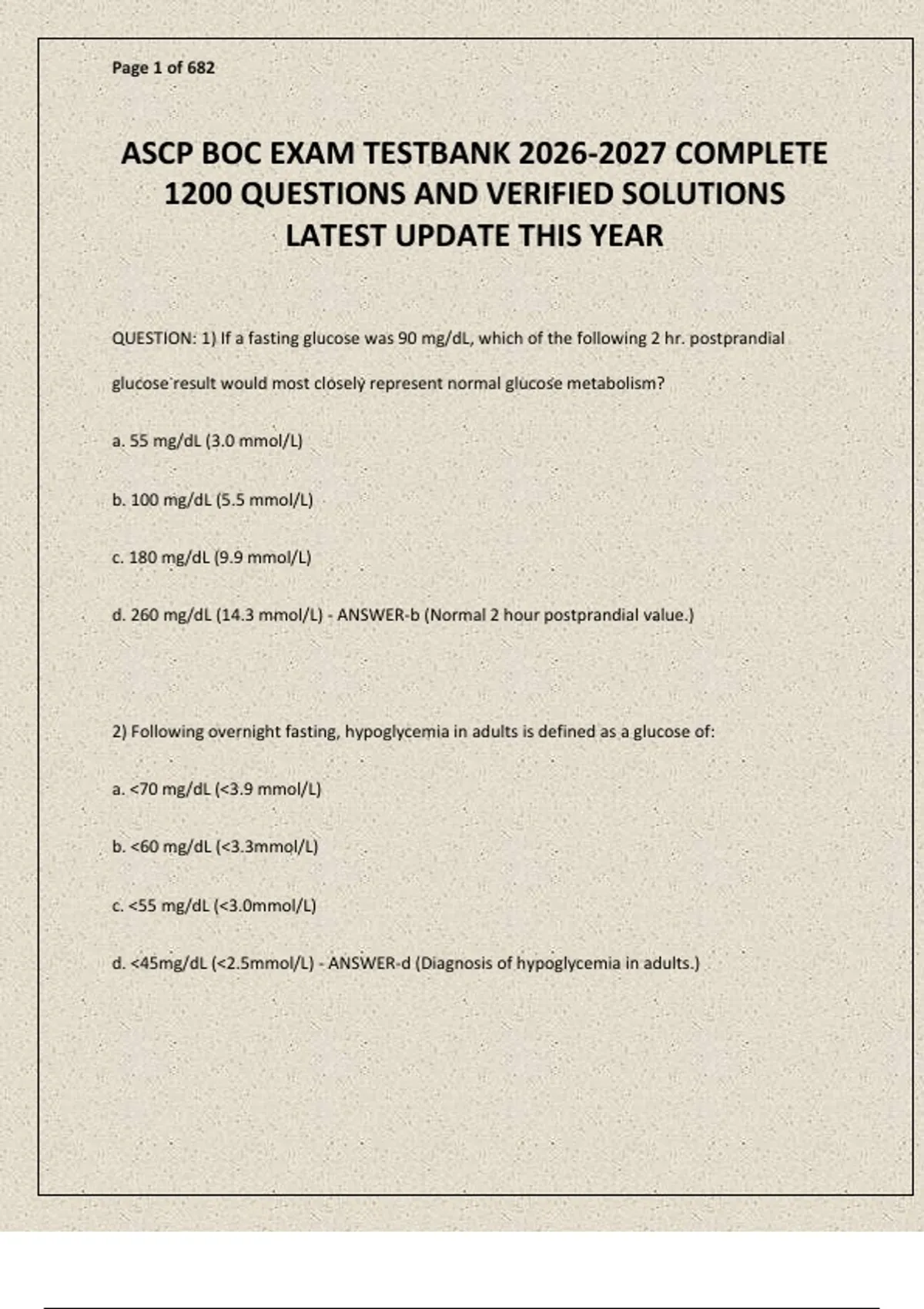 Tap on AVAILABLE IN BUNDLE / PACKAGE DEAL to unlock free bonus exams — save more while getting everything you need! ASCP BOC Exam 2026–2027 – Complete Questions with Verified Solutions PDF (Latest Update This Year) is a fully updated and comprehensive preparation resource for candidates preparing for the ASCP Board of Certification (BOC) exam. This guide includes exam-style questions with verified solutions, fully aligned with current ASCP BOC standards and industry best practices. Coverage includes clinical laboratory science, hematology, microbiology, chemistry, immunology, molecular diagnostics, laboratory safety, quality control, and applied problem-solving scenarios. Questions are designed to strengthen technical knowledge, critical thinking, and practical decision-making in real-world clinical laboratory settings. Ideal for medical laboratory professionals, clinical practitioners, and ASCP BOC exam candidates, this resource provides thorough review, targeted practice, and confident exam performance for the 2026–2027 testing cycle.